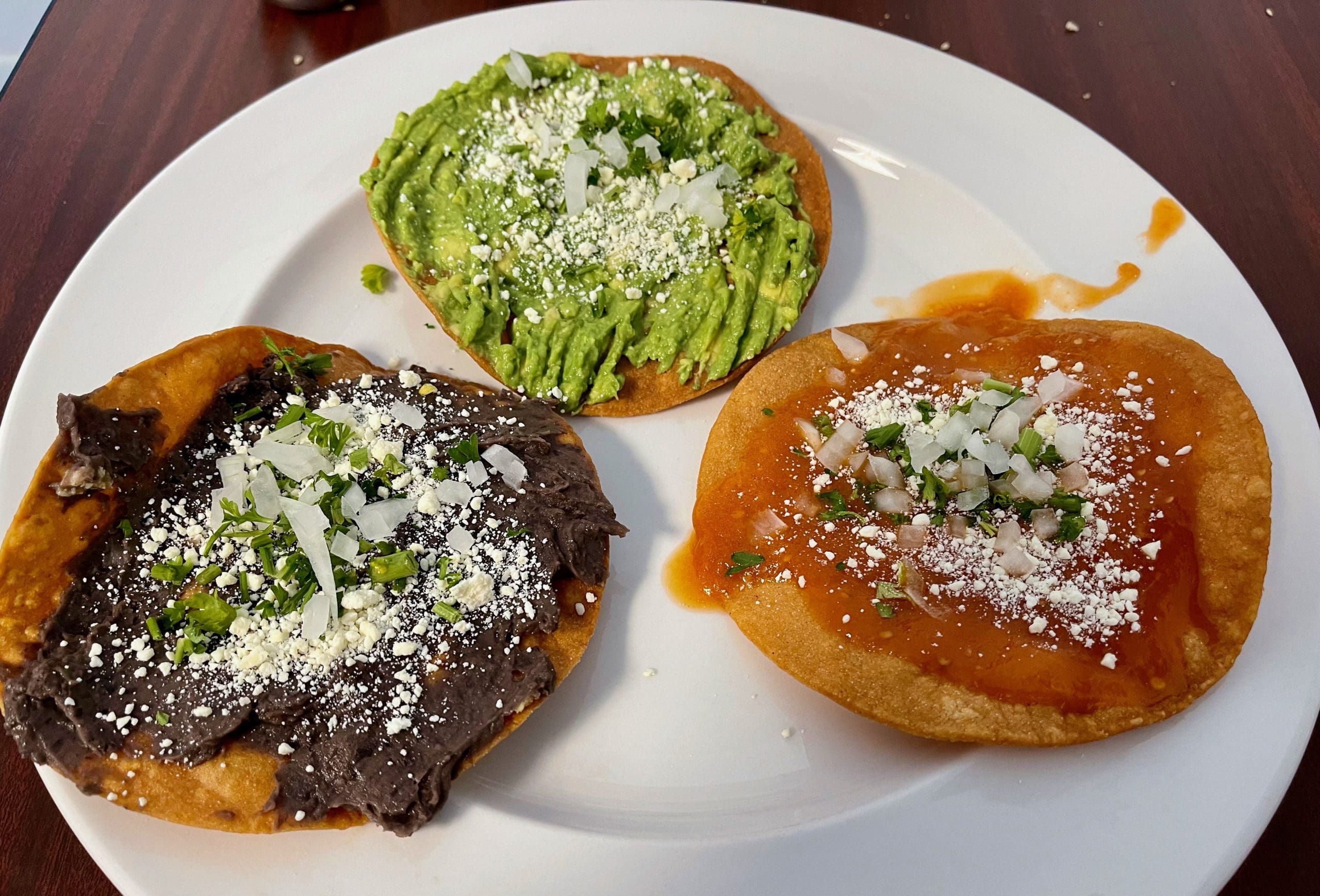 Tostadas have become a ubiquitous source of carbohydrates and deliciousness across the American continents. Like a proverbial tabula rasa (blank slate), crispy corn tortillas form a canvas for sundry toppings. You can literally top a tostada with anything edible. In Guatemala, one of the more popular toppings is a large dollop of noodles along with other toppings typically found on spaghetti. Eterna Primavera offers tostadas topped with guacamole, onions and grated dry cheese. By the way, Guatemala is one of the original birthplaces for avocado in the world. Also available are tostadas topped with beans, onions and cilantro; and tostadas topped with a mild salsa, onion and cilantro. None of the tostadas would be considered gourmet foods, but they’re tasty and delicious.