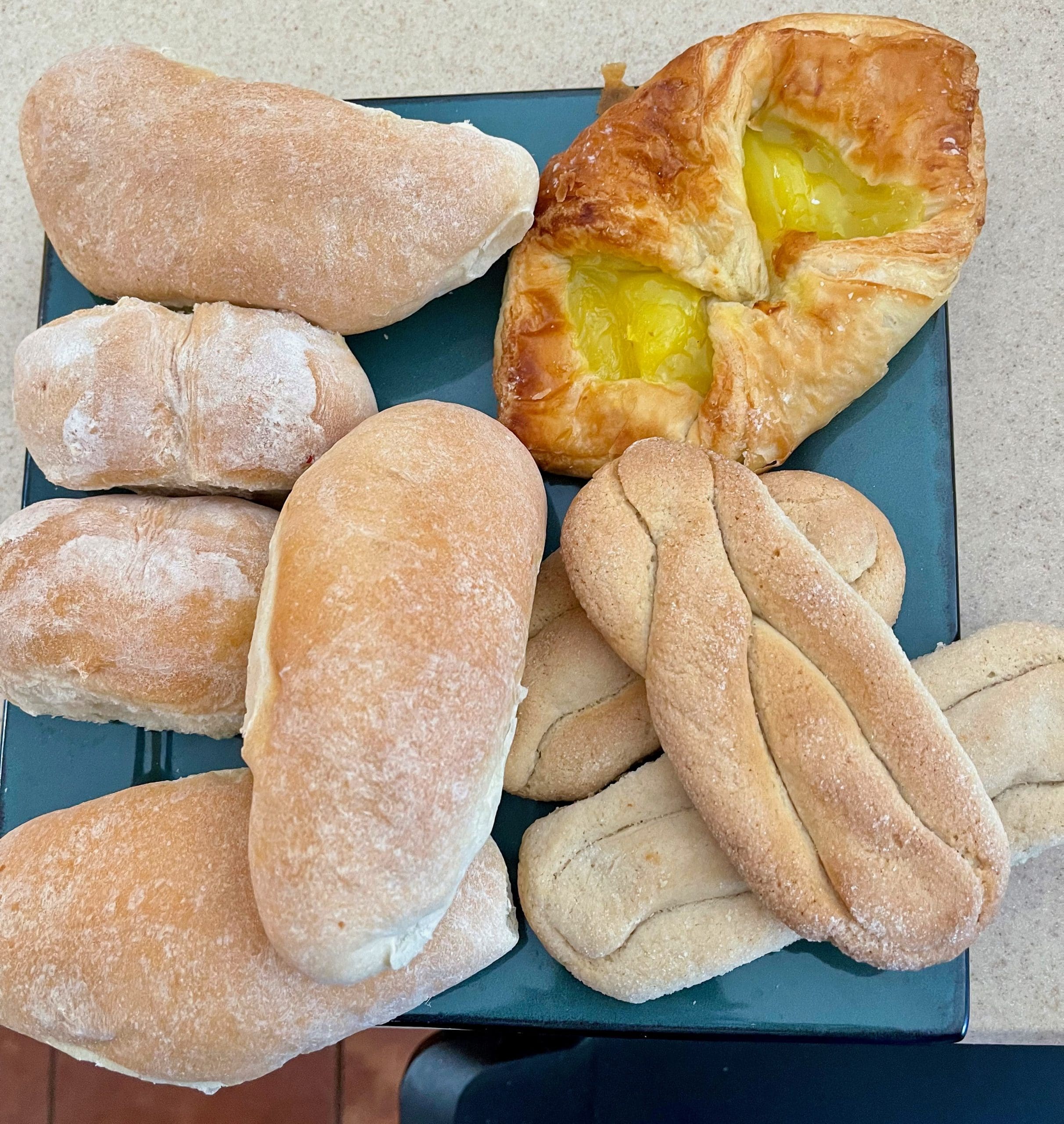 A treasure trove of breads and pastries awaited us as we sauntered over to the registrar to settle up. We couldn’t decide what to have so we had several items. The bolillo bread is reminiscent of German brotchen from Dagmar’s Delectables in Rio Rancho. It makes a wonderful canvas for condiments as a sandwich. A pineapple turnover was also reminiscent of the incomparable strudel at Dagmar’s. There’s something within the pastry case for everyone who appreciates the staff of life or some post-prandial sweets.