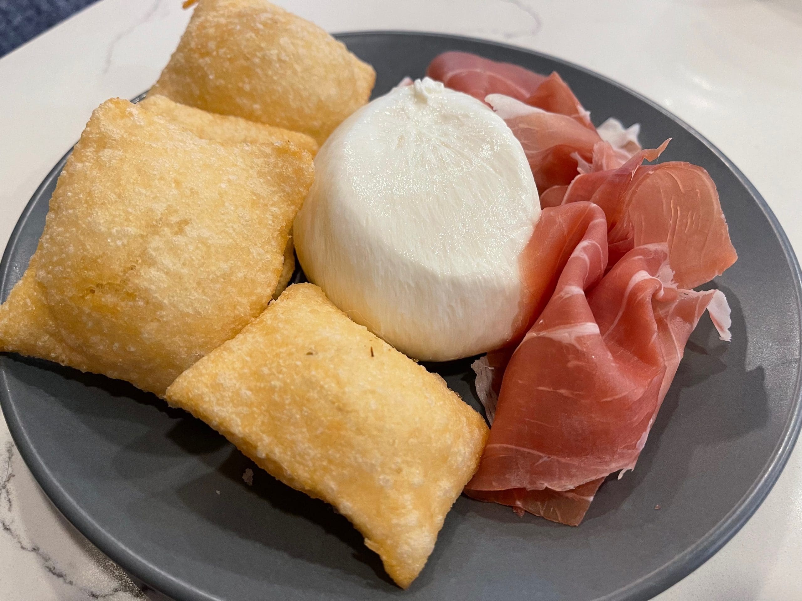 While coccoli may sound like El Cucuy, the Mexican bogeyman purported to punish misbehaving children, it’s not even close. Coccoli translates to “cuddles” in Italian and refers to Tuscany’s favorite little balls of fried dough. At first glance the three coccoli resemble little sopaipillas and indeed, they’re puffy pillows of fried dough. Taste them and you’ll quickly note how much saltier coccoli are than sopaipillas. Otherwise, they’d probably go quite well with honey. Coccoli are served with prosciutto so thin you can practically see right through it. It’s prosciutto Di Parma, one of the gold standards of prosciutto. Also served with the Coccoli is a burrata, perhaps best described in Castello cheese website: “Burrata is a perfect blend of contrasting textures working together to create a landscape of soothing delights. Its soft shell wrapped around a creamy center delivers a clash of sensations and a buttery consistency unlike any other.”