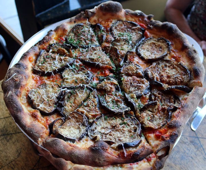 18 July 2018: It used to be that pizzerias were the bane of vegetarian existence because their pizza options not only rather limited, but as tedious as sitting in line at the Department of Motor Vehicles (DMV). Vegetarians could either have a cheese pizza or one adorned with such de rigueur ingredients as onions, green peppers, olives and mushrooms. Thankfully a phalanx of vegetarian ingredients adorn contemporary pizzas. Vegetarian choices a plenty can be found on Farina’s pizza menu. My friends and UNM colleagues Sue Jones and Sandra Chavez, two exemplars of healthful dining, rave about the Melanzane (salsa di pomodoro, eggplant, basil, oregano and mozzarella). Melanzane, the Italian term for eggplant is the star of this pie. More than most vegetables, eggplant has a “meaty” quality and a nice acidity. In its roasted state, eggplant retains its unique flavor and a burst of moistness that blends so well with the salsa di pomodoro, a rich tomato sauce.