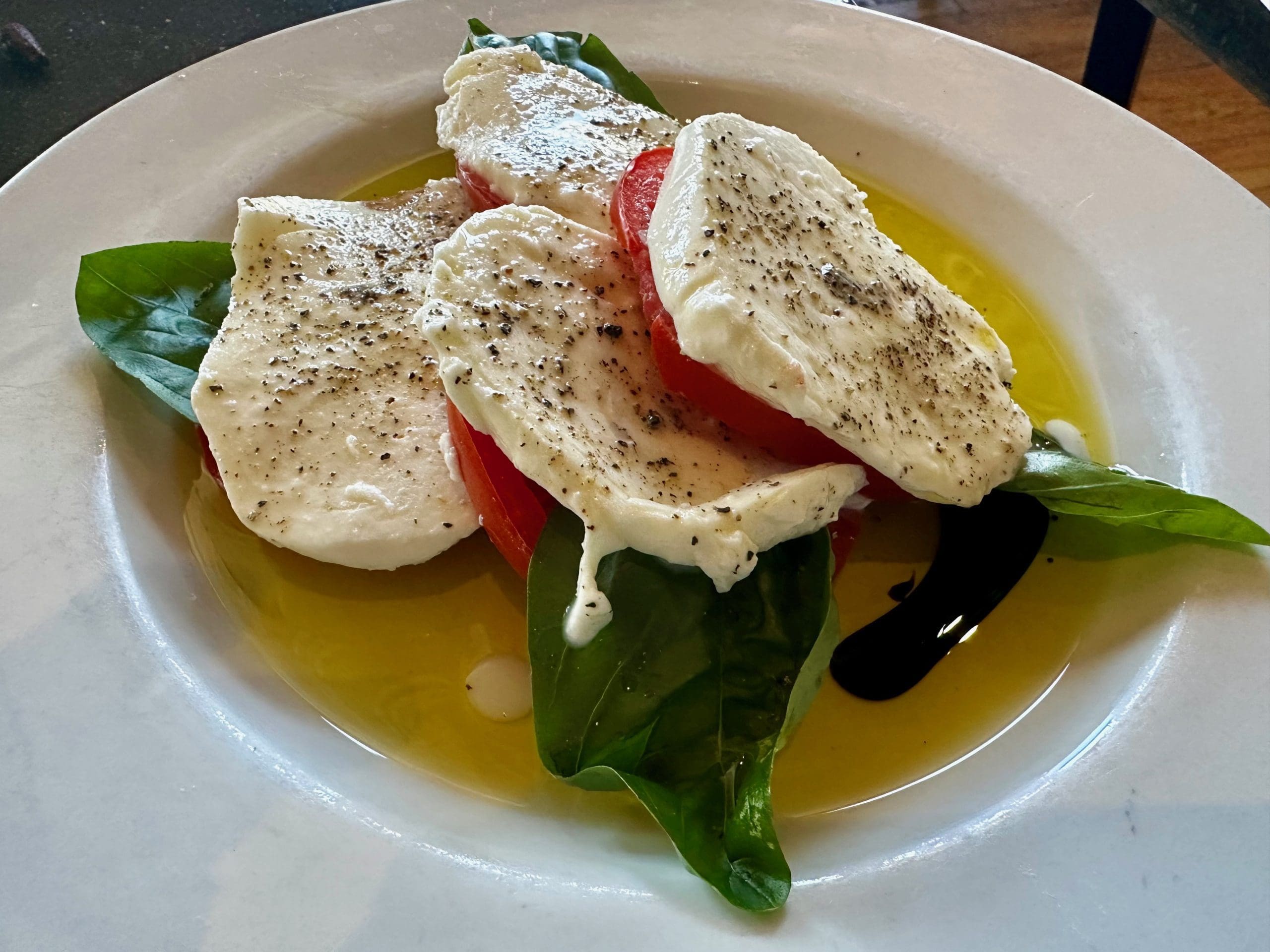 6 September 2024: My Kim’s quest for the quintessential calabrese salad has taken us to several eateries, most of which create a salad with tomatoes nearly as green as The Hulk. We should have started with Farina which sources its tomatoes locally from three different farms. Not only were the tomatoes meaty and juicy, they were at the optimum ripeness. My Kim declared them “the most delicious tomatoes in Albuquerque.” The calabrese salad arrived in a pool of olive oil with just a dollop of balsamic vinegar (with more on the side). The mozzarella, made in-house, is creamy and ivory in color specked with pepper and has a mild, fresh lactic flavor. Several large basil leaves provided a clove (or licorice) like flavor and aroma.