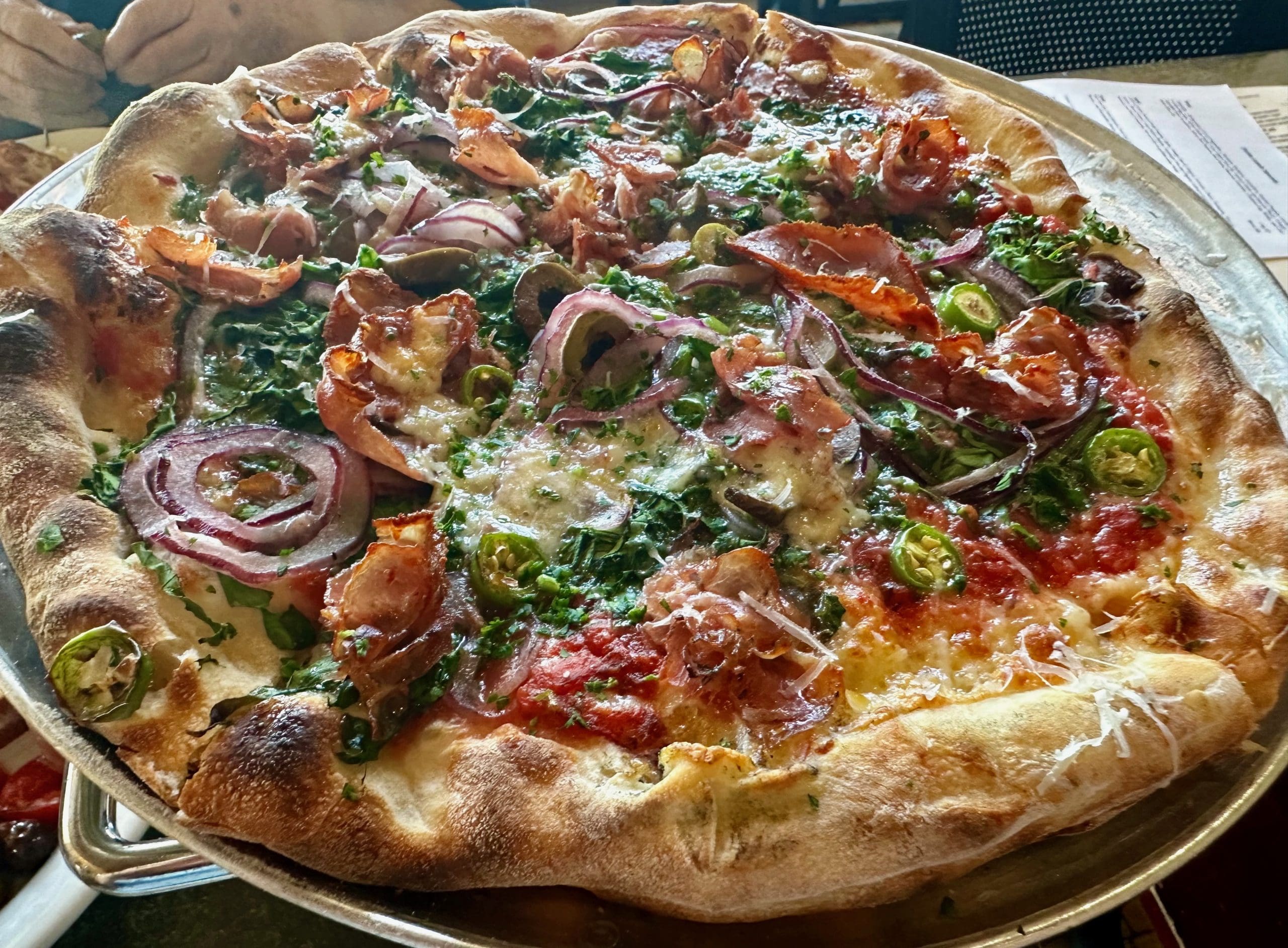 6 September 2024: A paper menu listed the day’s specials including one titled simply “Pizza.” There was nothing simple about this pizza, a glorious disc piled with spicy cappicolo (gabagool for New Jersey transplants and Sopranos fans), fresh spinach, fresh red onion, serrano peppers, mixed Italian olives, Farina’s tomato sauce, rustico and mozzarella cheeses garnished with Italian parsley, grana padano and extra virgin olive oil. It’s a wonder so many ingredients can fit on such a thin crust. My Kim and I eat far fewer pizzas per year than the average American (5.75). This one we could eat every day (though I’d have to discard the serrano peppers which have a potency even I can respect). Seriously, this is an outstanding pizza, so good it should be named with all the pomp and circumstances of a ship’s christening. May I suggest this pie be named for Eliza Esparza, Farina’s formidable chef, who in 2024 won the Best Chef award at Edible New Mexico’s Local Hero Awards