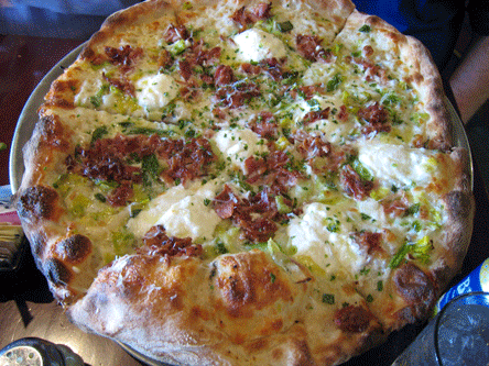 The other pizza Ryan ordered for us was the Formaggio de Capra (mozzarella, farmhouse goat cheese with leeks, scallion and pancetta), a cheese and bacon lover’s dream. The goat cheese imparts a mild, slightly acidic, slightly tart quality while the mozzarella is reminiscent of fresh milk. Both are generously applied to this pizza, but it’s their interaction with the pancetta that’s most notable. Pancetta may be the most “porky” tasting of all pork products, rightfully so considering its genesis is pork belly. Goat cheese and pancetta are among my favorite flavor combinations anywhere so it goes without saying, this pizza is one I’ll order again. The nice couple sitting next to us described their Funghi (mushrooms, Fontina, Tallegio, mozzarella, thyme, shallot) as “a pizza which tastes like French onion soup.” Wow! I wish I had thought of that. What an apt description of the slice they shared.