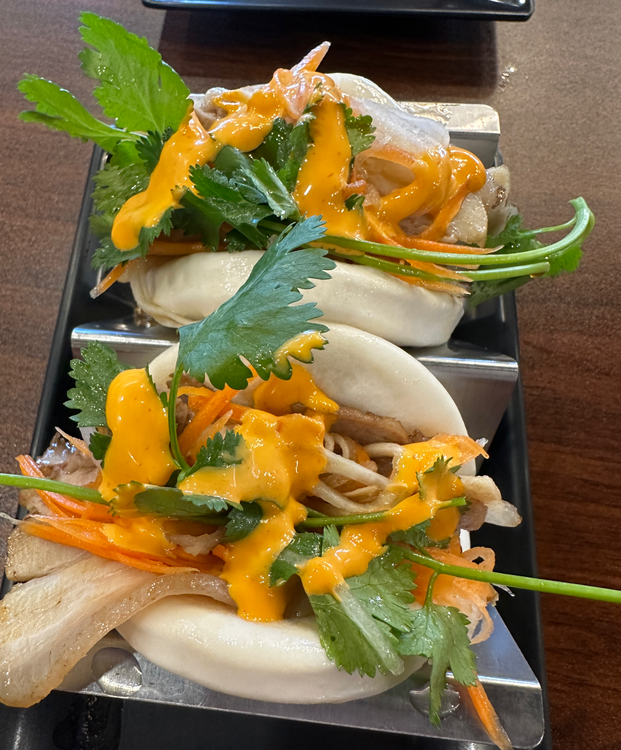 30 November 2025: Just a few years ago, had you mentioned “bao buns” many of us probably thought you were talking about a small, round bread roll with butter, a hipster hairstyle, or a person’s buttocks. Today, bao buns are widely known as fluffy, cloud-like buns with a delicious savory or sweet filling. Though they’ve been enjoyed across Asia for hundreds of years (invented in China during the 3rd Century), they’ve only recently become a global culinary trend. The two main components of a bao are the filling and the steamed bread wrapping. The dough for bao buns is typically made from wheat flour, water, sugar, and yeast, and it creates a soft, fluffy texture when steamed. Pho Nho’s steamed bao buns are made with your choice of filling–marinated pork belly, beef or chicken topped with white onion, mayonnaise, mint and pickled carrots. The “mayonnaise” has the kick of a baby mule. It’s too piquant for my Kim though most New Mexicans will want even more of it.