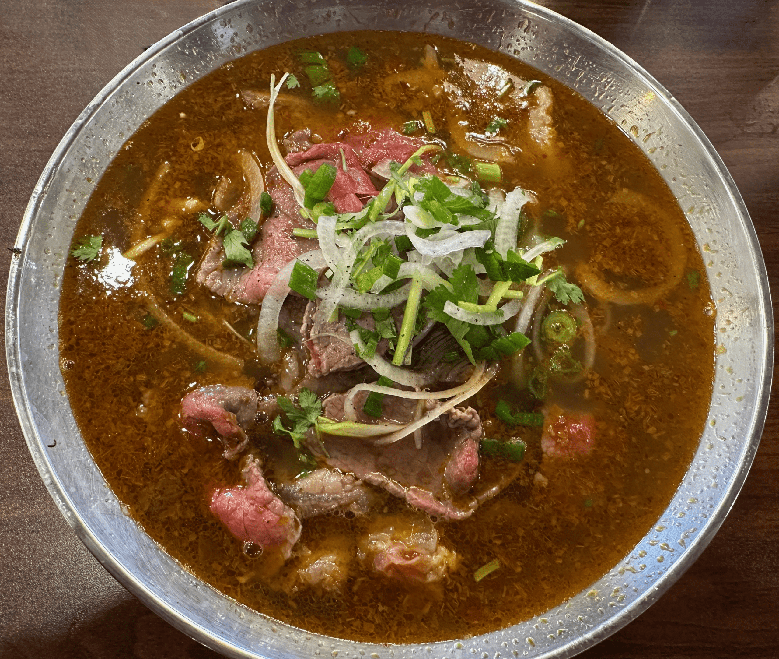 30 November 2025: Pay particular heed to the section of the menu titled “Vietnamese Beef Favorites.” My very favorite of all Vietnamese soups is in that section. That’s Bún bò Huế, listed on the menu as spicy lemongrass noodle soup. What distinguishes Bún bò Hue from pho is that the former is a spicy, savory, and robust noodle soup with a bold broth flavored by lemongrass and fermented shrimp paste, served with thicker, round noodles, while pho is a milder, more aromatic soup with a clear beef or chicken broth and flat, rice noodles. To me, it’s about personality. My preference is for something that will awaken and titillate my taste buds, something with eye-opening ingredients such as pork hocks and coagulated pig’s blood. Pho Nho’s version doesn’t come standard with the coagnulated pig’s blood, but it does come with pork hocks, tendon, rare beef and beef flank. That’s a carnivore’s orgiastic delight. Pho Nho will prepare it for you with udon noodles or thinner vermicelli noodles. This is a top tier soup!