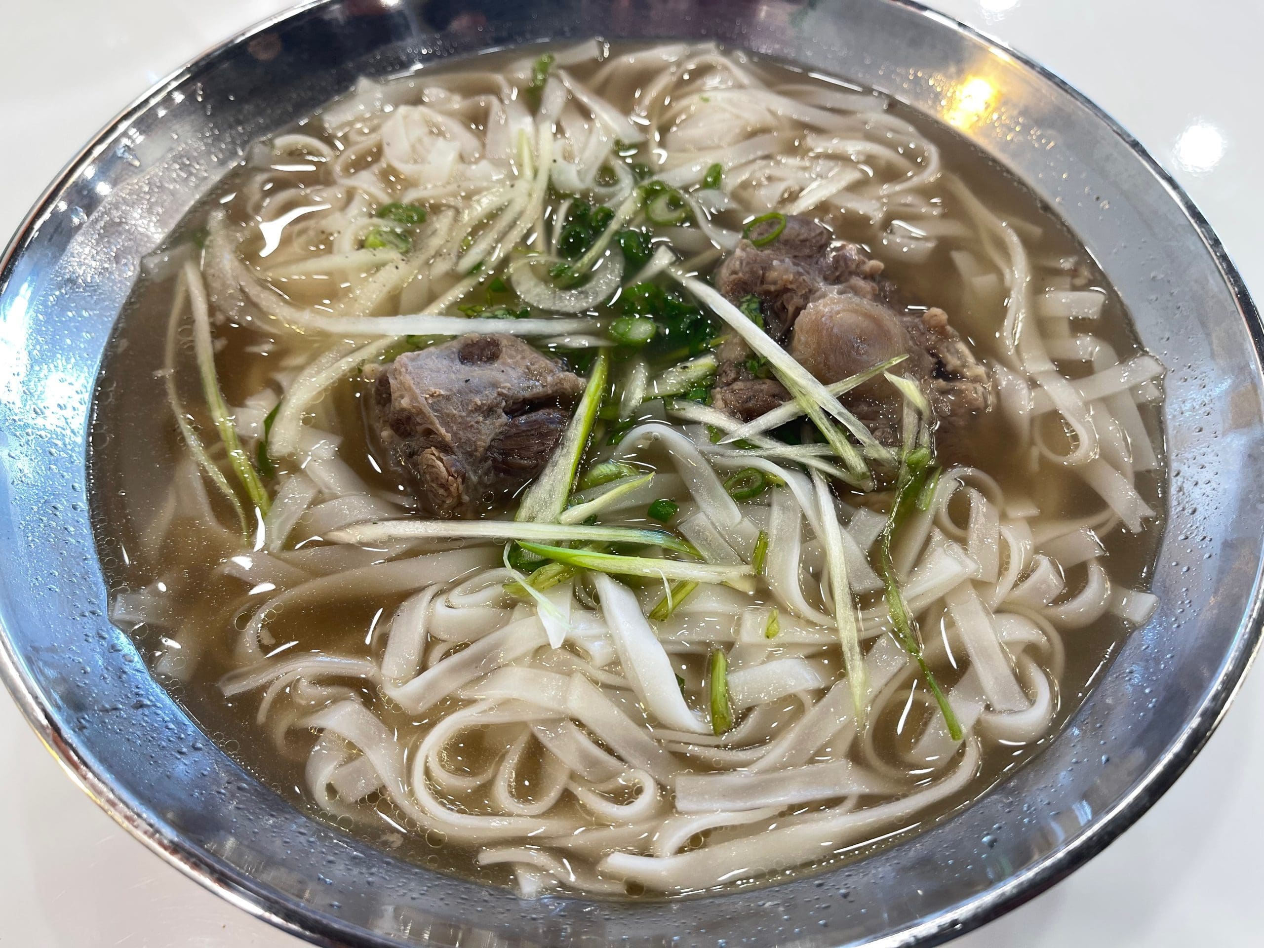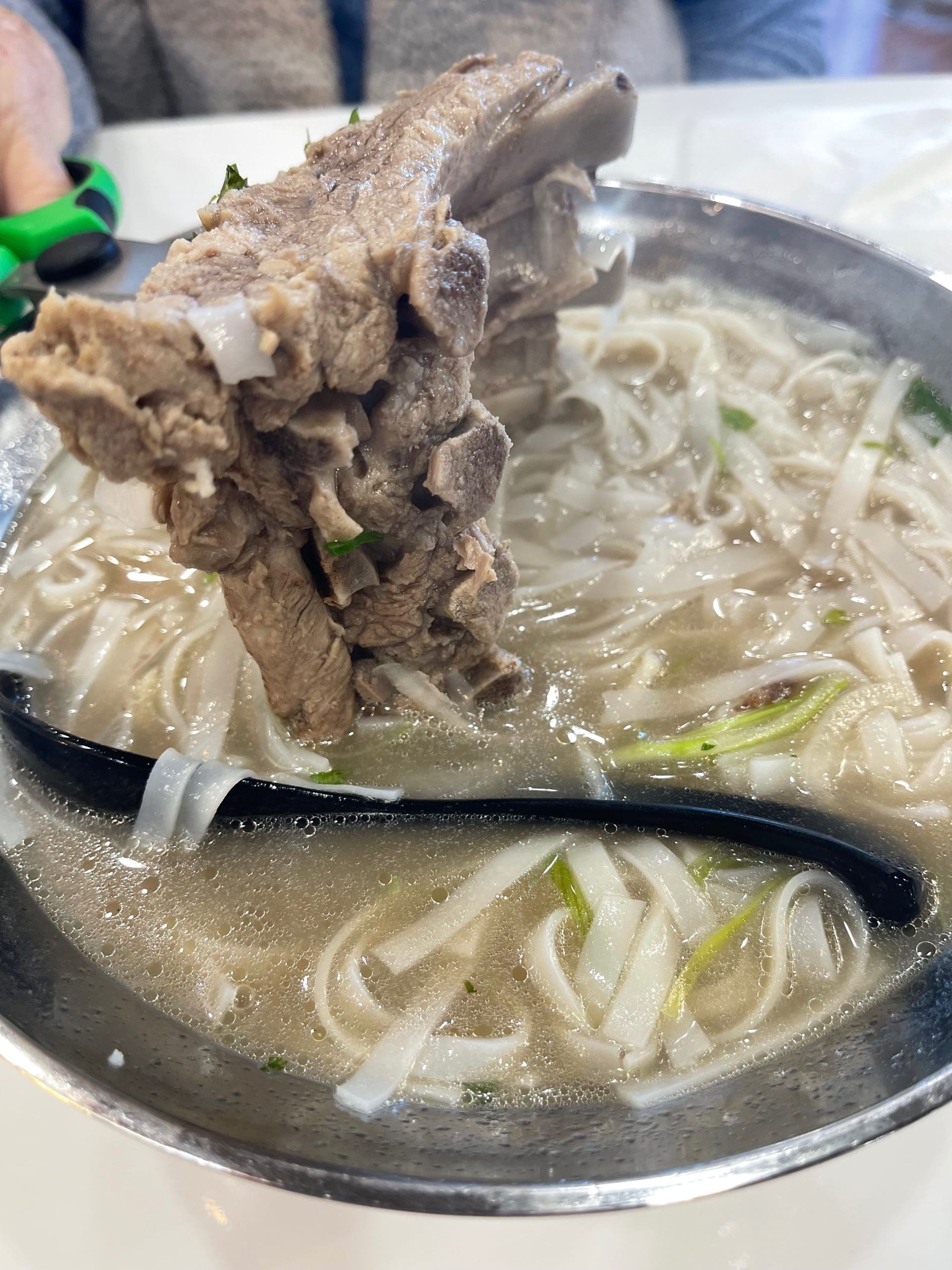 9 December 2022: My Kim had an equally rare (in Albuquerque) pho–pork ribs noodle soup. We were handed a pair of scissors with which to separate the five meaty (porky?) ribs. Each rib is replete with tender, unctuous, sinfully good meat. The meat is reminiscent of the beef you’ll find in a great Mexican caldo de res (beef stew) for its tender, umami-rich, deeply earthy flavor. Pork ribs noodle soup is the essence of pho, the beef noodle soup carnivorous foodies dream about. Globules of glistening fat testify to the influence of the fatty, meaty, absolutely delicious pork ribs.