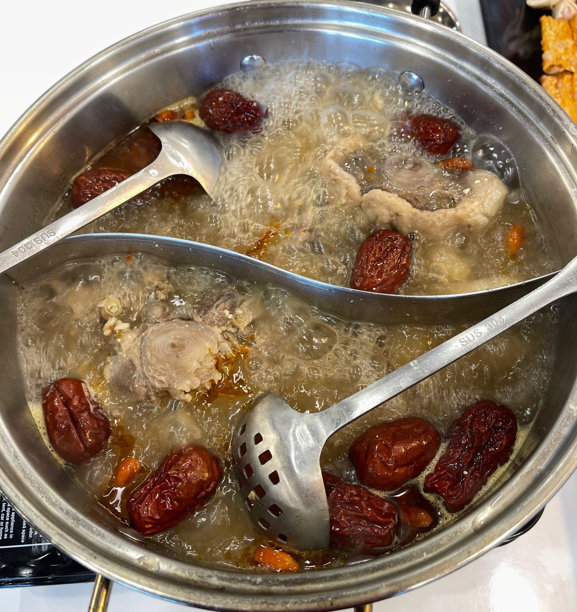 16 December 2022: If you’ve ever visited Zu Hot Pot on Albuquerque’s east side, you’re familiar with the concept of hot pot. In my estimation, Pho Nho takes that concept and elevates it (or maybe because it tastes so much better, it seems elevated). As with all hot pot meals, it’s intended for two…even two trenchermen like Tuan and me. First to be delivered to our table was a portable one burner stove. Then came plates of wide, flat egg noodles, fresh vegetables (mushrooms, herbs, dried bean curds, napa cabbage) and cubes of tofu. Last to be delivered was a potful of steaming broth in which reconstituted jujubes (Chinese dates) swam. Submerged just below the surface were four of the largest oxtails Tuan had ever seen.