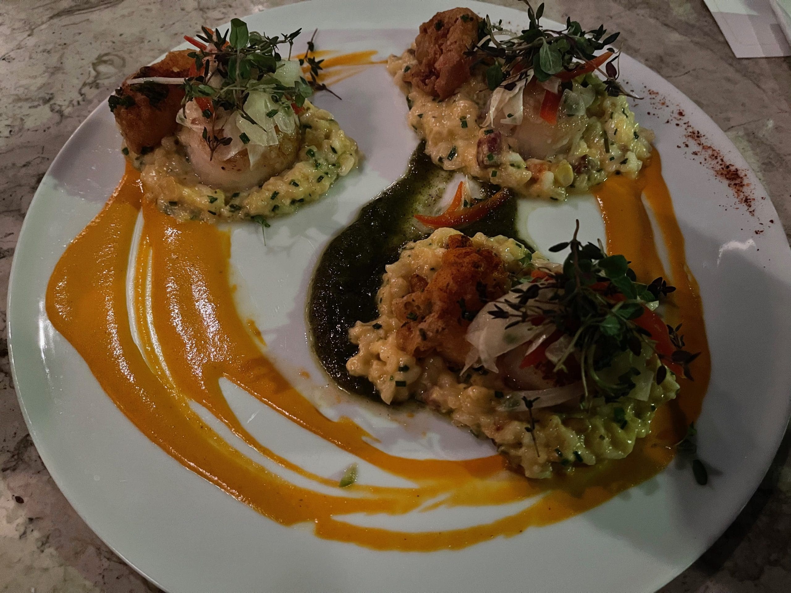 You can never know for sure what you’ll get when you order diver scallops (a term which refers to the method of harvesting. Instead of being dredged, these scallops are harvested by hand by actual divers). I’ve always though that because of their inherent qualities, diver scallops don’t need a lot of amelioration. Still, curiosity got the best of me in reading the menu’s description of diver scallops (manchego, corn and chorizo risotto, crispy rock shrimp, charred scallion, red pepper, shaved fennel, lemon vinaigrette). That litany of ingredients could easily have overwhelmed the sweet scallops had they not those ingredients been so perfectly proportionate to the magnificent bivalve mollusks. The corn and chorizo risotto served as the base for a crispy rock shrimp and a juicy, tender scallop, a surprising textural contrast of two seafood favorites. If fault can be found in my Christmas dinner entree, it’s that I could have devoured an entire bowl of the risotto and a dozen or so of the succulent scallops.