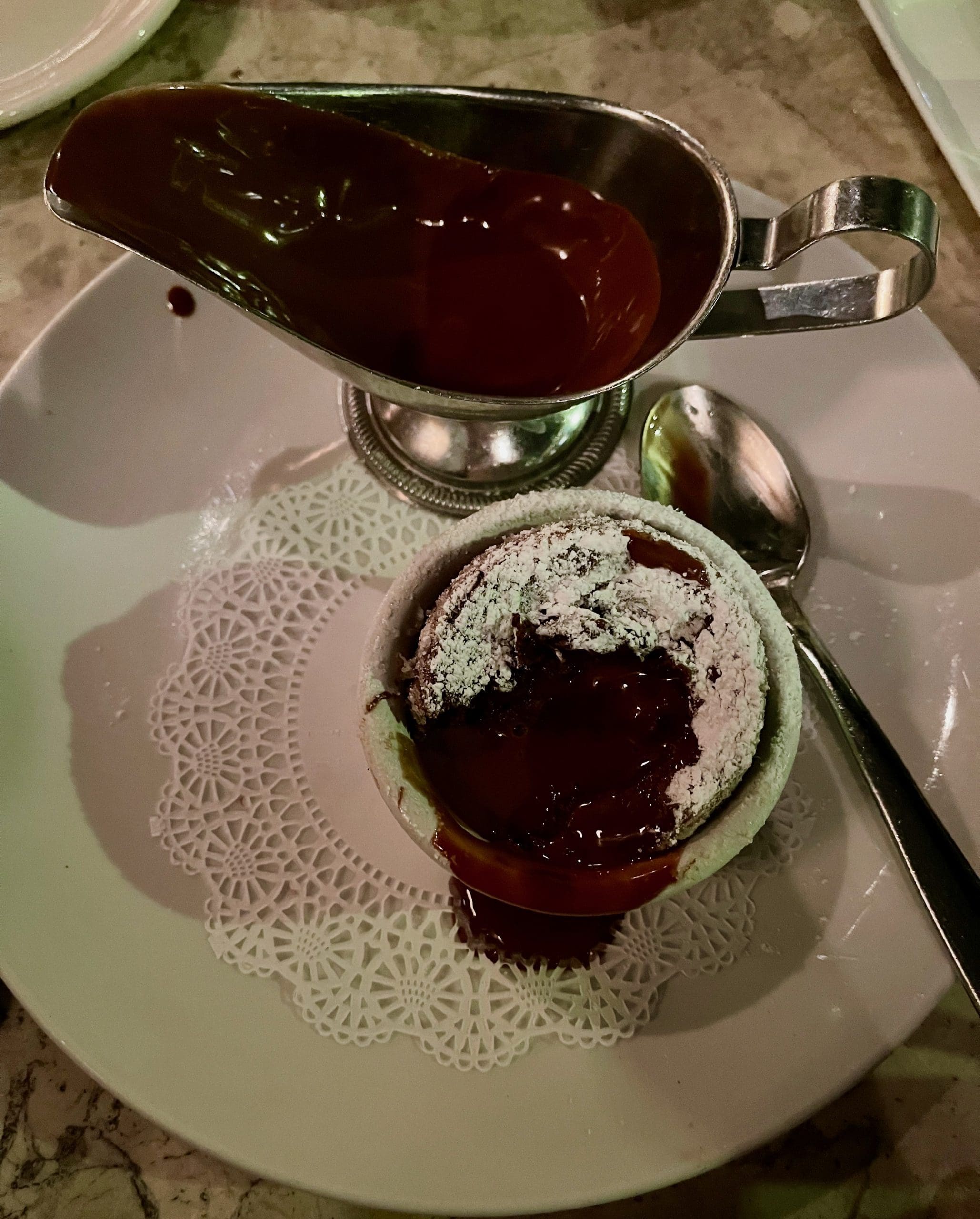 BEST BET: Chocolate Soufflé, Diver Scallops, Pâté Maison, Onion Soup Gratinee, French bread and butter