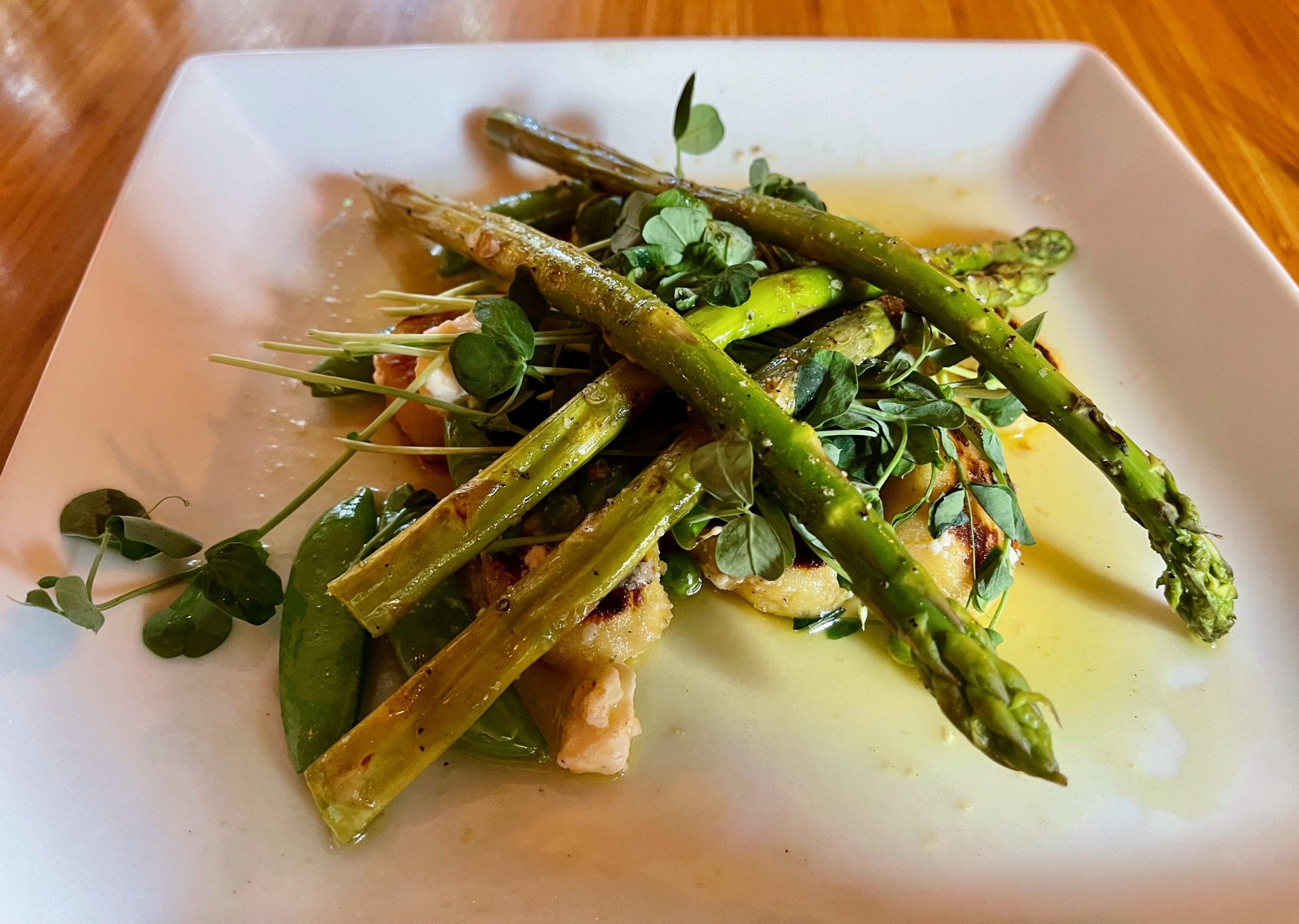 The Love Apple’s housemade, pan-fried potato gnocchi (served with sugar snap peas, grilled asparagus, lemon juice and feta) is one of the very best dishes we’ve ever had. Rather than the tired old, seemingly de rigueur red sauce, this gnocchi was sauced simply with butter, garlic and feta. While I’m in a declaring mood, gnocchi should always be made with potatoes. It is NOT a pasta. The Love Apple pan fries each delicate potato dumpling to absolute perfection. Each gnocchi is a mouth-watering delight.