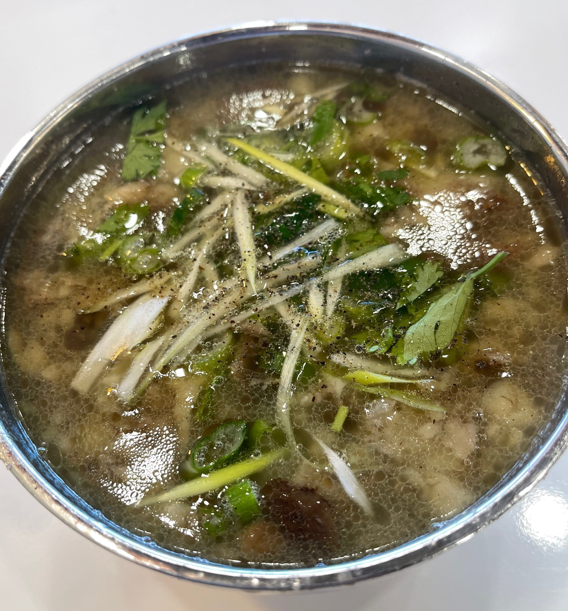 My friend Tuan and I weren’t thinking about the health benefits of the fabulous beef marrow soup we enjoyed at Pho Nho. Quite the contrary. We were solely focused on how luxurious and indulgent the beef marrow soup was. We both polished off an entire bowl of this enchanting elixir, taking particular notice of the globules of fatty goodness. ALL beef pho broth should have a layer of fat covering its surface. These globules of unctuous deliciousness add great beefy flavors to the broth and retain a lot of the spice flavors that make it a pho broth and not just regular beef stock.