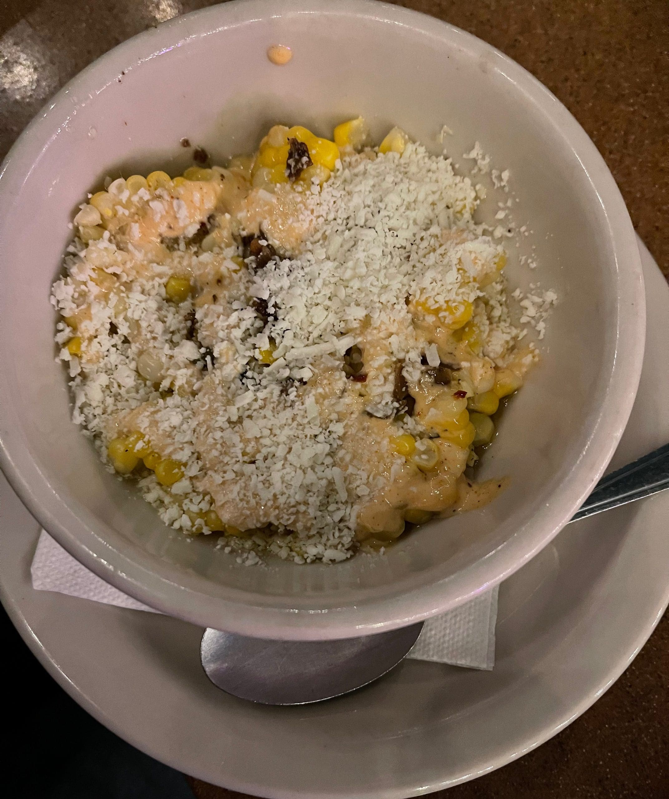 Interestingly she didn’t find the grilled elote–available on the cob or scraped onto a bowl–especially piquant even though a chipotle aioli is one of the two primary ingredients (the other is cotija cheese). We’ve had better grilled elote in the Land of Elotechantment, but this was quite good. Having been raised on a farm in which we grew our own corn for roasting on an horn for chicos, I was weaned on elites and have rarely encountered one that didn’t make me happy.