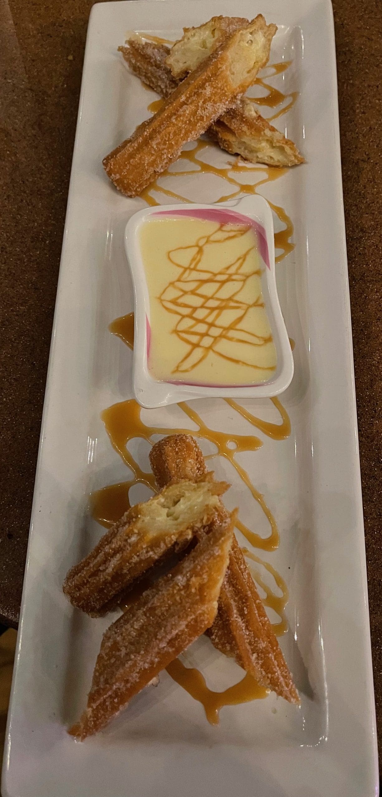 Cocina Madrigal offers three desserts. My choice would have been the chocolate chipotle pie, but it’s not something my Kim could enjoy. We opted instead for the churros (Bavarian cream filled with Creme Anglaise and caramel sauce). These are top tier churros with flavor notes characteristic of most churros, but with textural contrasts that made them special. So was the Creme Anglaise, a notable difference from the chocolate sauce normally served with churros.