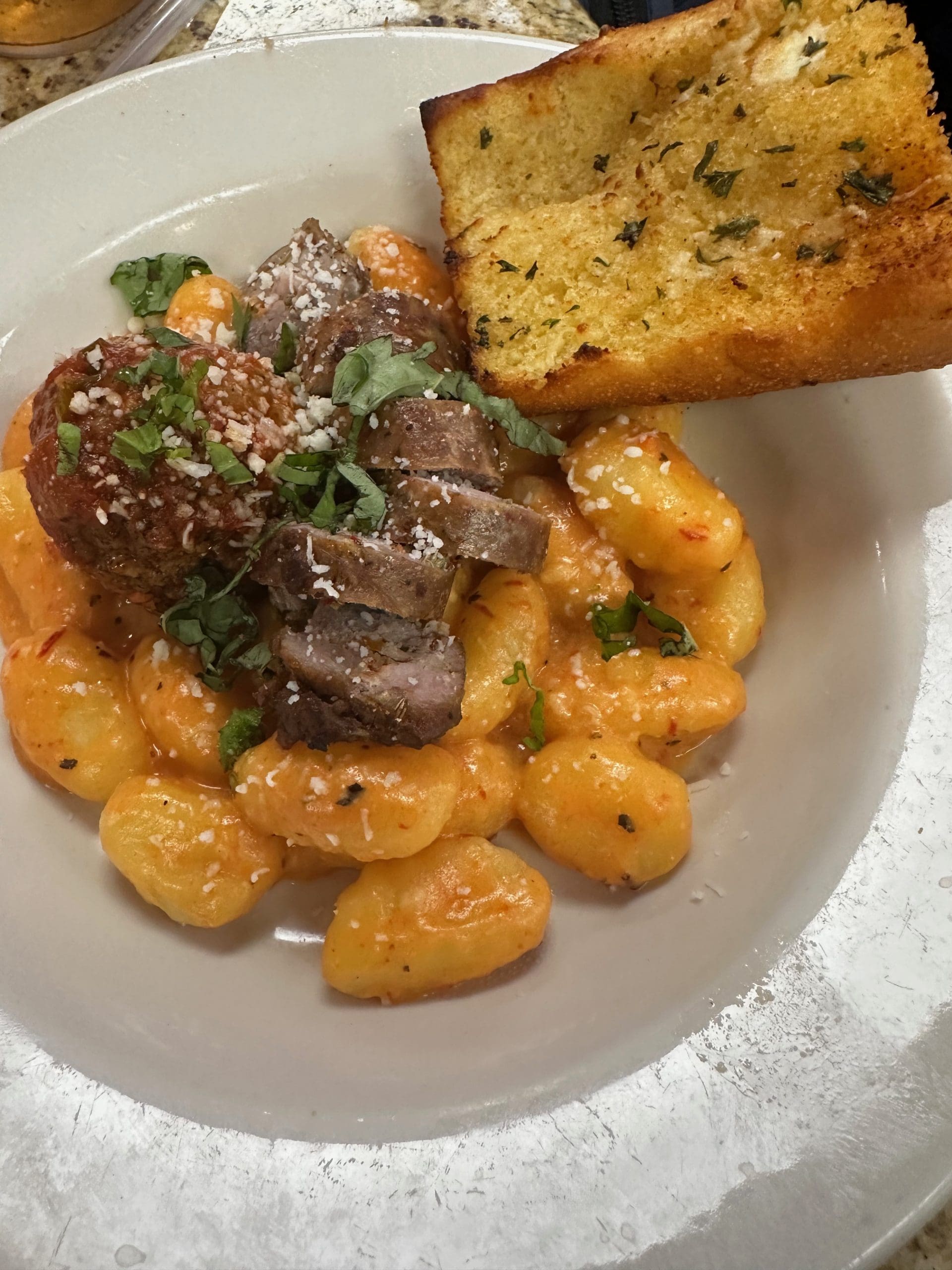 We decided instead on the gnocchi Pomodoro (red and white cream sauce, pine nuts and fresh basil garlic) with both meatballs and Italian sausage. Despite sharing an order of the soft, fat and chewy dumplings, our equal shares were pretty prolific. The gnocchi is characteristically rich and buttery, each dumpling unbelievably delicate. It’s hard to imagine anything other than the red and white cream sauce topping the gnocchi. Golfball-sized meatballs and incendiary Italian sausage provide a counterbalance to the richness of the sauce while the basil enlivens the flavor of the dish.