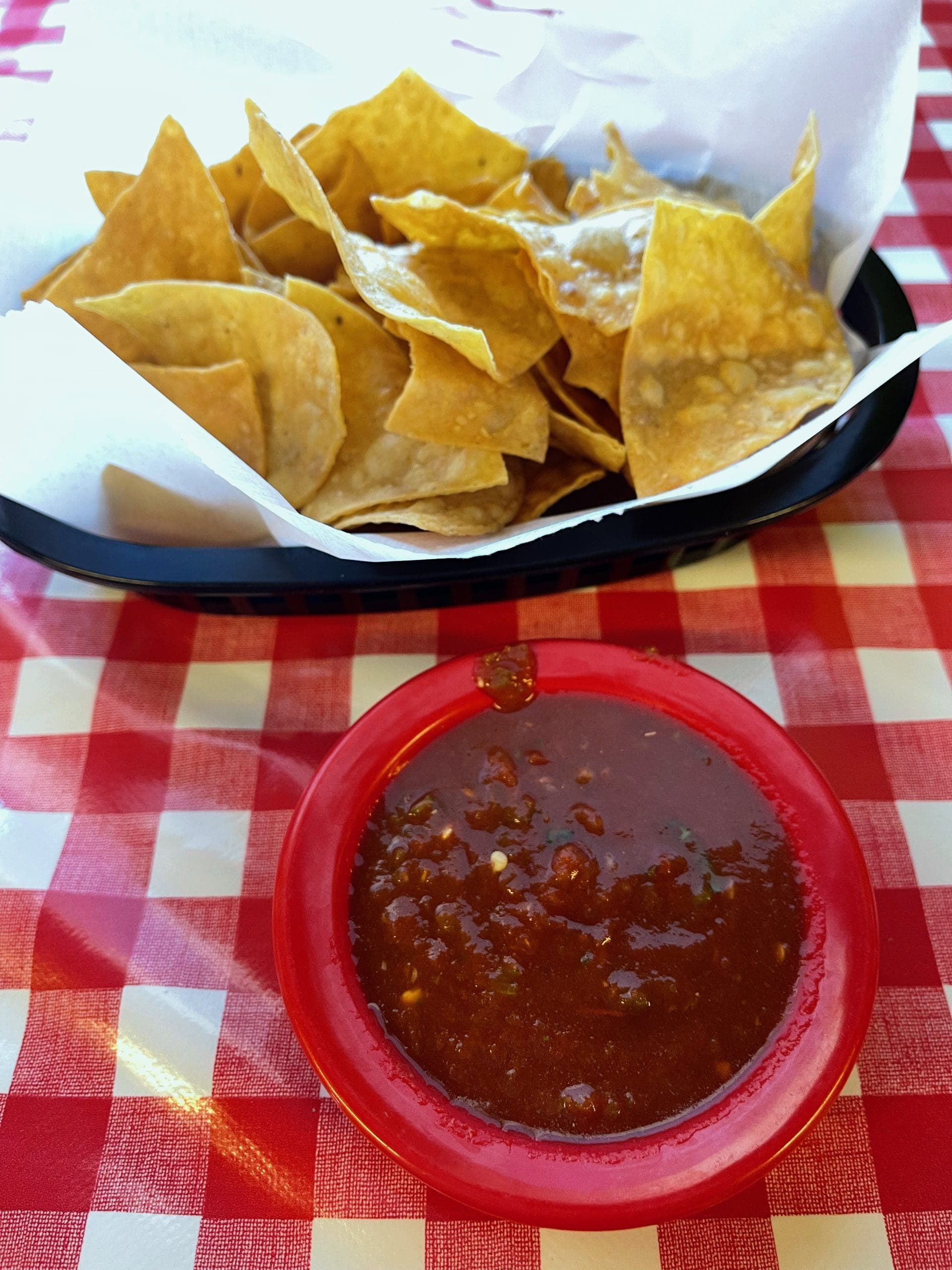 Gentlemen that we are, John and I wiped out two servings of salsa and two baskets of chips without sharing. We didn’t want our brides or Louise to burn their tongues (and if you believe that…). The salsa is among the very best in Albuquerque with a pleasant piquancy based on jalapenos. Its dark red hue is flecked with cilantro. The chips are lightly salted and crisp. Best of all, they’re formidable enough for Gil-sized scoops of salsa. John is a man after my own heart. Like me, he’s unfazed by piquancy and if possible, would load each chip with shovelfuls of salsa. The salsa is complementary, a practice not many restaurants continue in this build back better economy.
