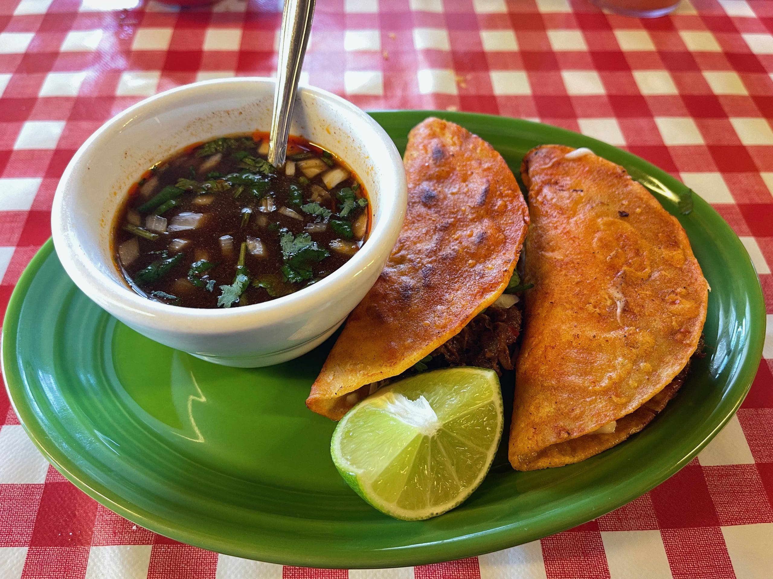In the past decade or so, perhaps no taco has ascended so highly on America’s radar than the birria taco and its cousin, the taco QuesoBirria. Yep, it’s birria (meat marinated in an adobo made of vinegar, dried chiles, garlic, and herbs and spices before being cooked in a broth) and queso–two great tastes that taste great together. Los Olivos version of birria is made with beef which is topped with cilantro and onions and accompanied by a consomme in which to dip the taco. The consomme isn’t as aromatic as some, but it’s rich and flavorful, a perfect vehicle for excellent tacos. You’ll note the taco shells are reddish in color, the result of having been momentarily immersed in the consomme. I frequently get asked where to find the best birria tacos in Albuquerque. My answer remains “I haven’t found a bad one.”
