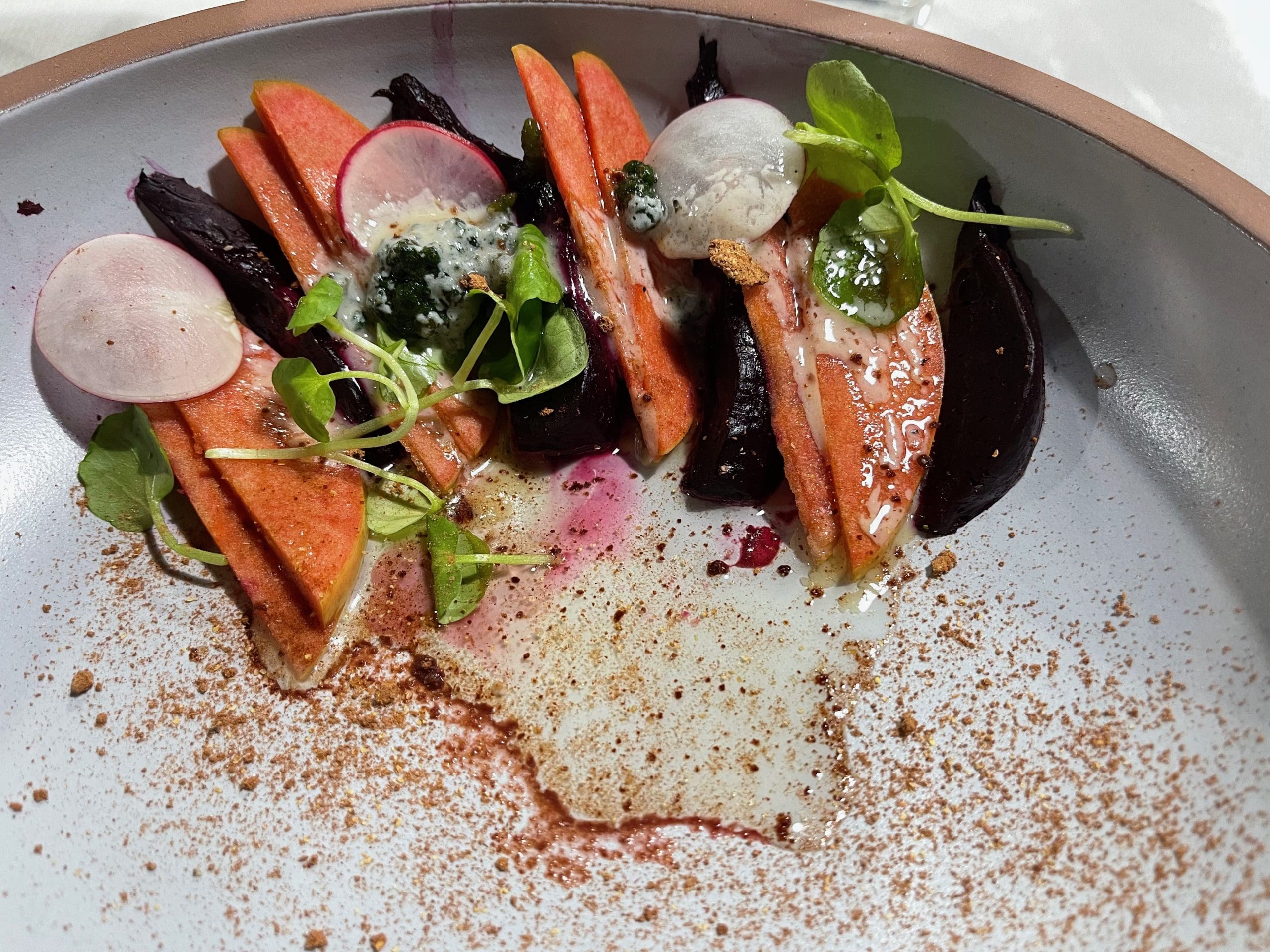 It became readily apparent to guests that plating is an art at the Pioche experience. Nothing is haphazardly thrown together on a plate. Chef Justin told me the plating is in keeping with the Navajo concept of “Hózhó,” a Navajo word that means “walking in beauty” (as Janice and Tia certainly do) – or living in a manner that strives to create and maintain balance, harmony, beauty and order. Janice elaborated that “Chef Justin was taught from his elders that Hozho is actually the balance between good and bad. We truly walk in harmony and beauty when we recognize the good and bad in life.” Beauty and order are evident in every plate. Even on a relatively simple chard salad (dandelion, beets, fruit, Manchego, apple cider dressing). Chef Justin introduced the salad as the “healthy portion of the meal.” Healthy certainly doesn’t mean ordinary. This was a delicious salad.