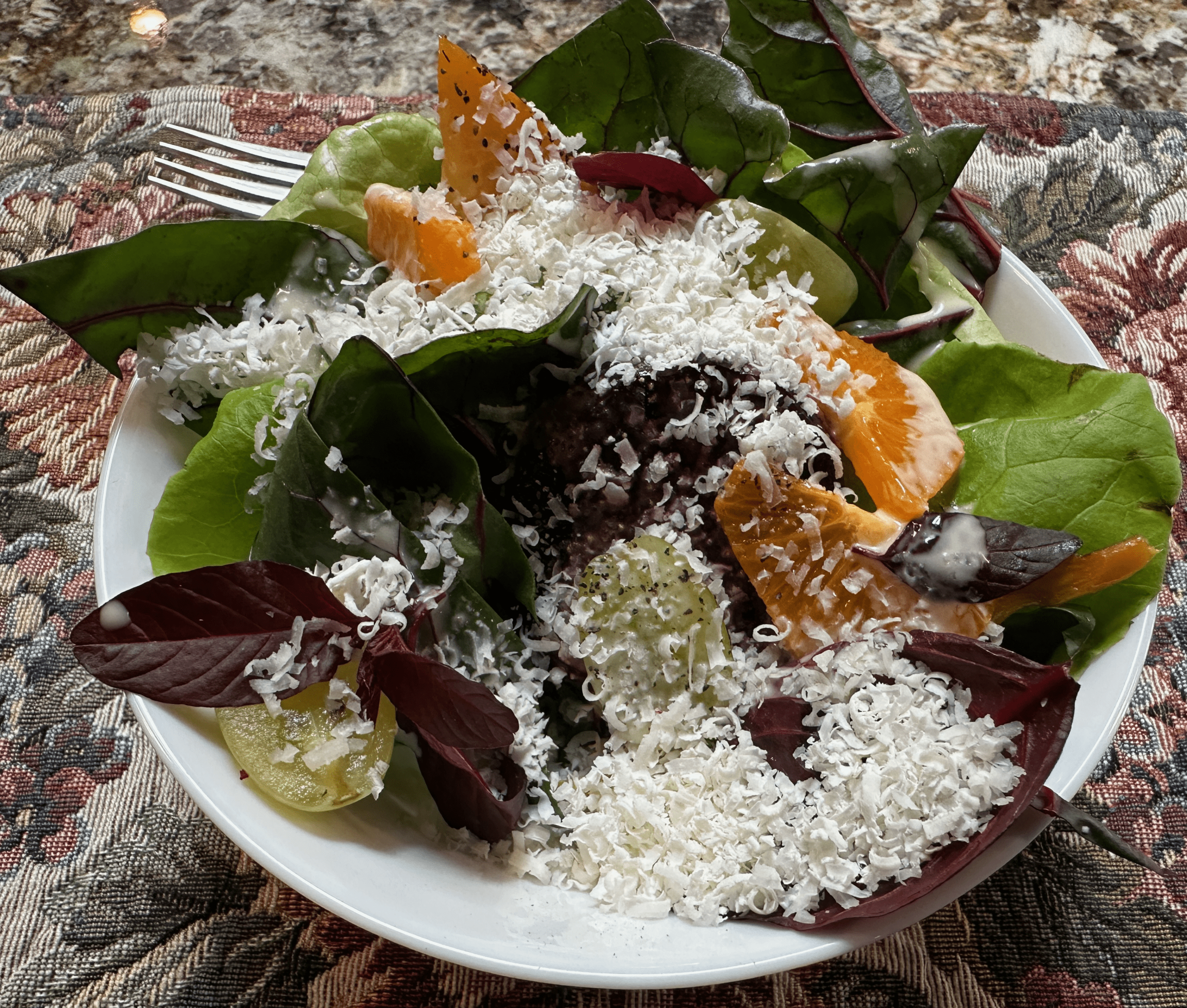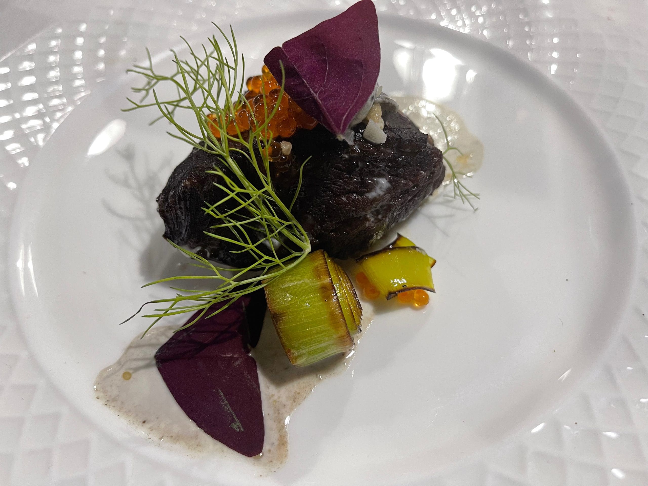 The main course of the evening was braised beef cheeks (charred leeks, marinated roe, sorrel, huitlacoche). Beef cheeks are highly esteemed by high-end chefs (think Michelin-starred restaurants) for their robust flavor and unique texture. Rich and savory with a soft, mouthfeel, they’re so tender you can cut them with a spoon or fork. Beefy notes permeate their essence. Justin’s mastery of slow-cooking techniques brings out the very best qualities of braised beef cheeks. Few beef dishes have wowed me as much. Ever! Justin also managed to transform huitlacoche (corn smut) from its native mushroom-like texture to a liquefied gravy form. It enhanced the flavor of the beef cheeks even further. Huitlacoche is one of my favorite foods in the universe. Tobiko eggs (fish roe) delighted the Pioche aunts who’d never had anything like it.