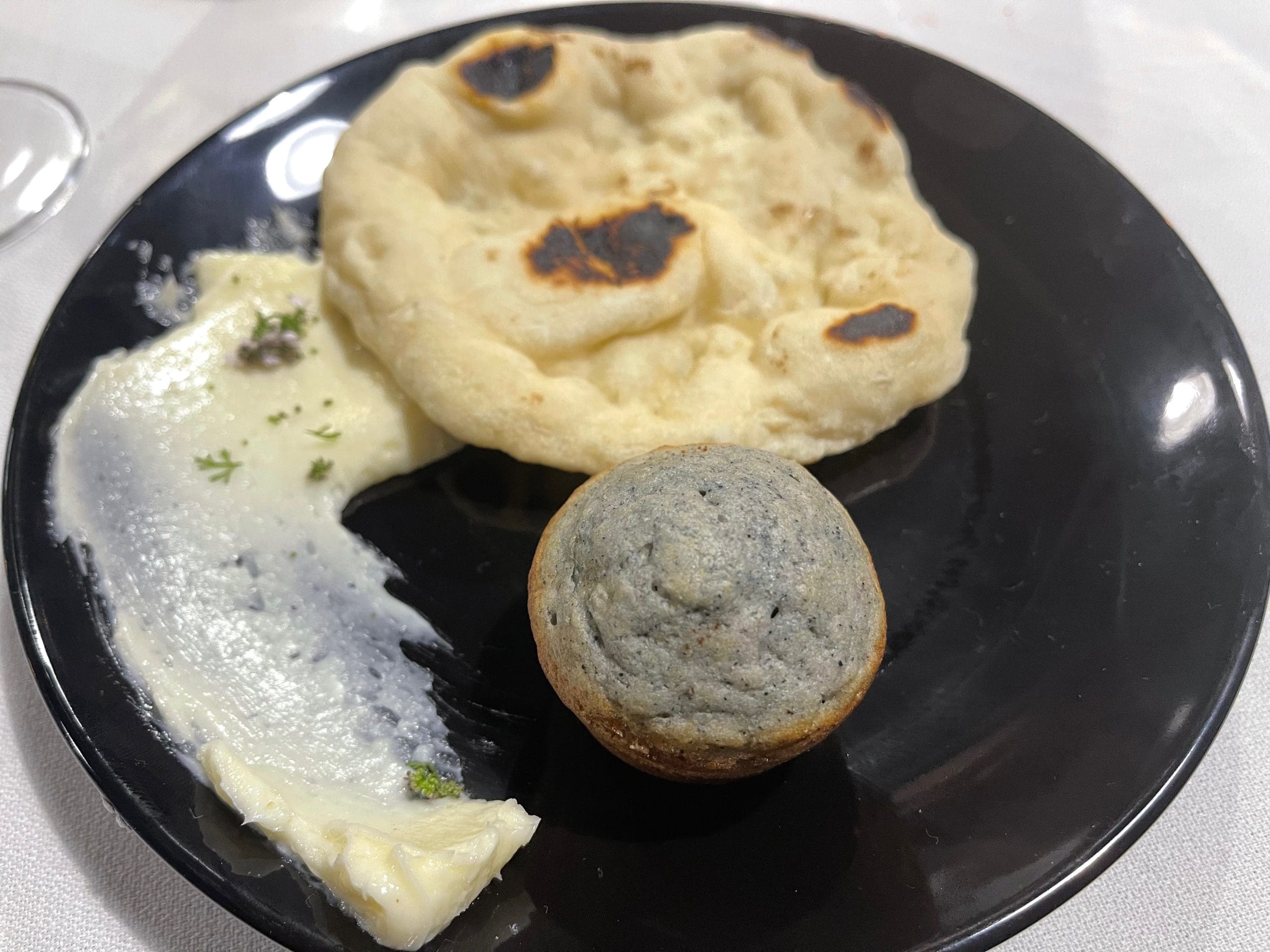 Tia’s culinary prowess was on display on the bread course (tortillas, blue corn, ramp butter, cilantro flour). She’s no slouch on the kitchen. Her tortillas reminded me of my sainted Grandma Andreita’s tortillas. Thicker and more dense than most tortillas, they just begged for butter and Tia provided among the best, most herbacious butter of my experience–a soft, easy-to-spread ramp butter. She described ramps as coming from the same family as onions and garlic, tasting very similar to a combination of the two. Also on the plate was a single blue corn muffin as thick, dense, moist and delicious as you can imagine.