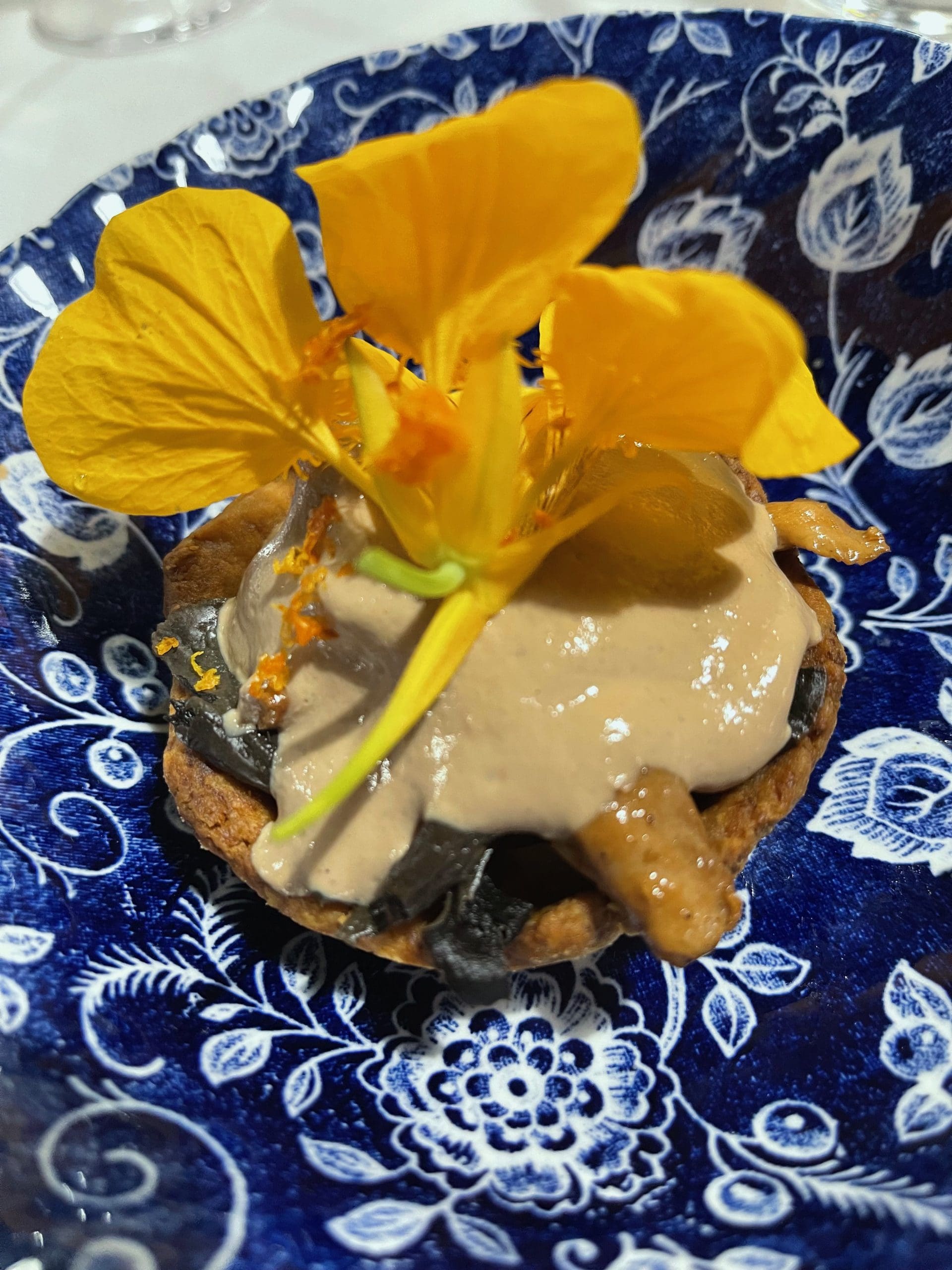 Reminiscent of a Georgia O’Keefe painting of flowers (without the sensuality) is the chanterelle tart (foie gras, black trumpets, nasturtiums, mandarin quats, thyme). Using the term umami to describe foods with mushrooms is probably cliche, but in this case so very accurate. Foie gras has a “beefy” rich and creamy flavor that pairs magnificently with chanterelles. Among mushrooms, chanterelles have a unique flavor in that they have discernible fruity notes and an aroma similar to apricots. Tia, whose main interests are in the hospitality side, baked the crusty tart. Nasturtiums are not only beautiful flowers, they actually possess a light peppery flavor.