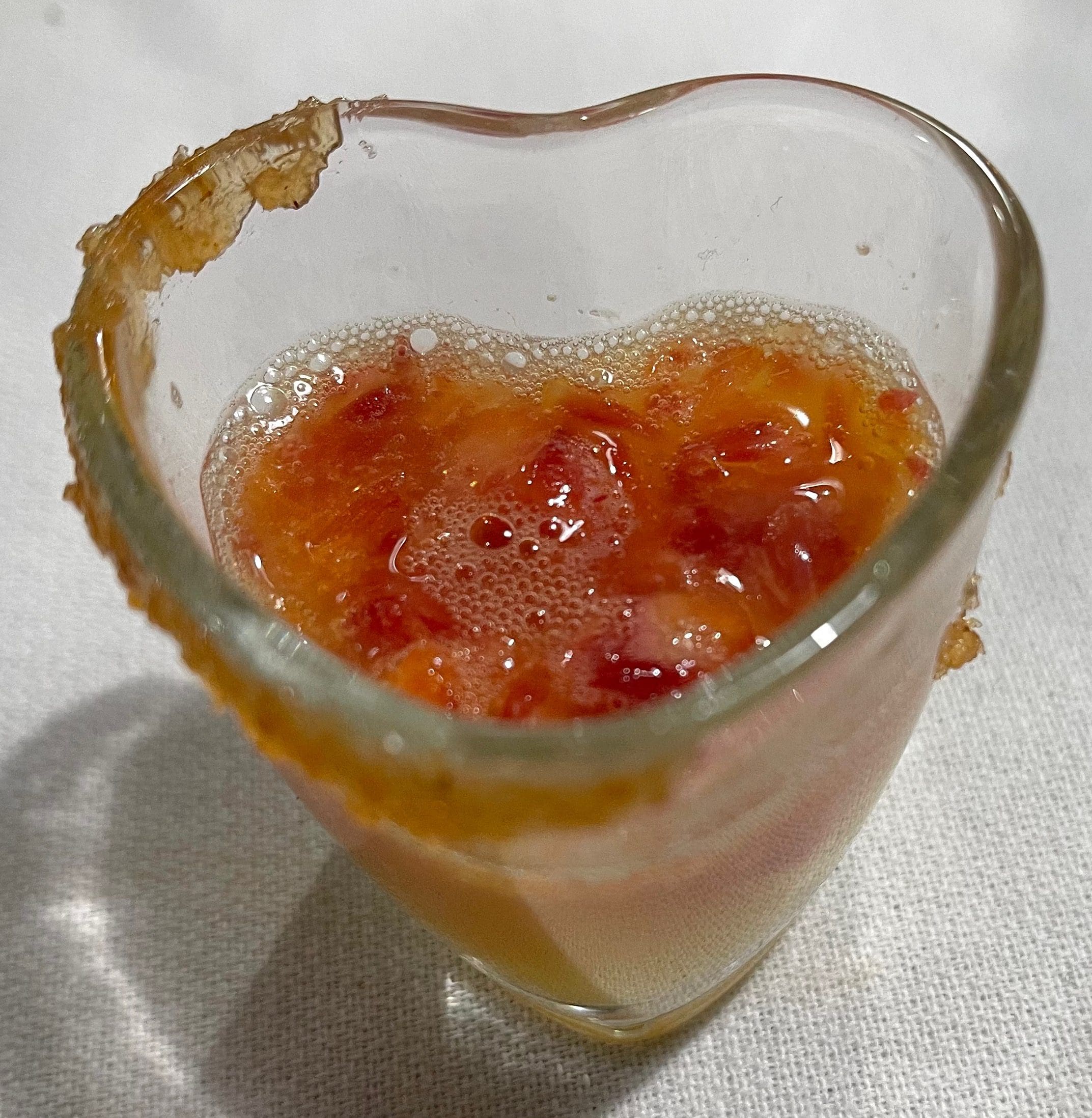 Intermezzo, an Italian term which means “a brief interlude or diversion” was next. Justin filled a heart-shaped shot glass with frozen blood orange. The shot glass had a quince rim, similar in principle but not taste to the salt on the rim of a margarita. Much as we may have wanted to slowly savor this refreshing palate cleanser, it was so good most of us downed it quickly. The quince rim was a nice tough. Unless cooked, quince can be very astringent, a quality which would not have been as greatly appreciated as the sweet, vanilla-like quince rim we licked off the glass.