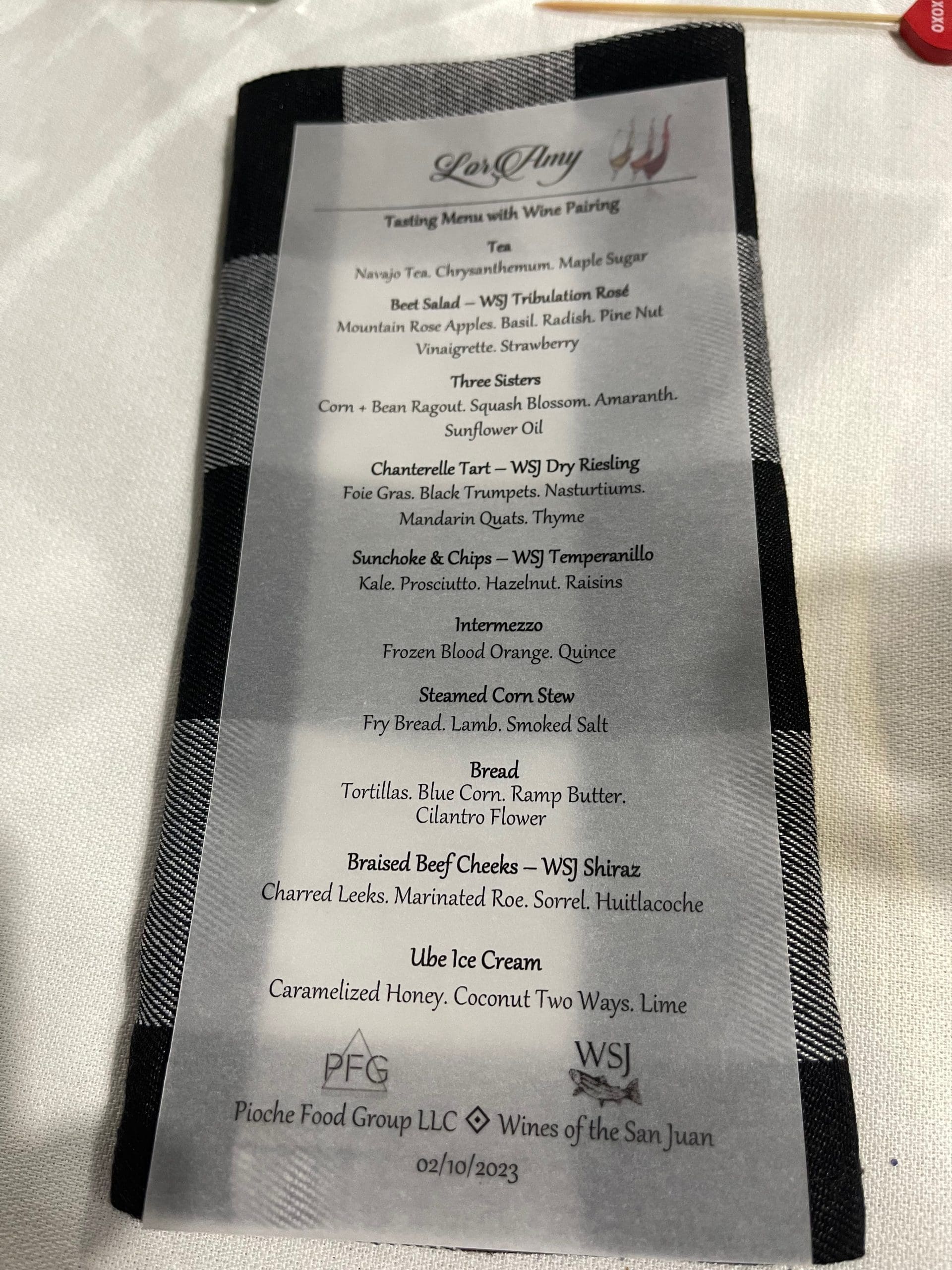 >My lack of knowledge of Navajo culinary culture and traditions having been revealed, I lept at Brian’s kind invitation. Besides the curious appellation “LorAmy” just beckoned for further discovery. Neither a Navajo culinary tradition or a culinary term, LorAmy is a Farmington pop-up dining series from Diné chef Justin Pioche of the Pioche Food Group. The name is a combination of the chef’s grandmothers’ first names, fitting considering the matrilineal traditions of the Navajo. Lorene is his mother’s mother’s name and Amy is his father’s mother’s name. At a table set for twelve, Chef Justin presents a varying seasonal menu (usually around 8 courses), inspired by his Navajo culture. Unexpected palate-pleasing twists and turns are sure to please you as the Pioche family puts their hearts on a plate.