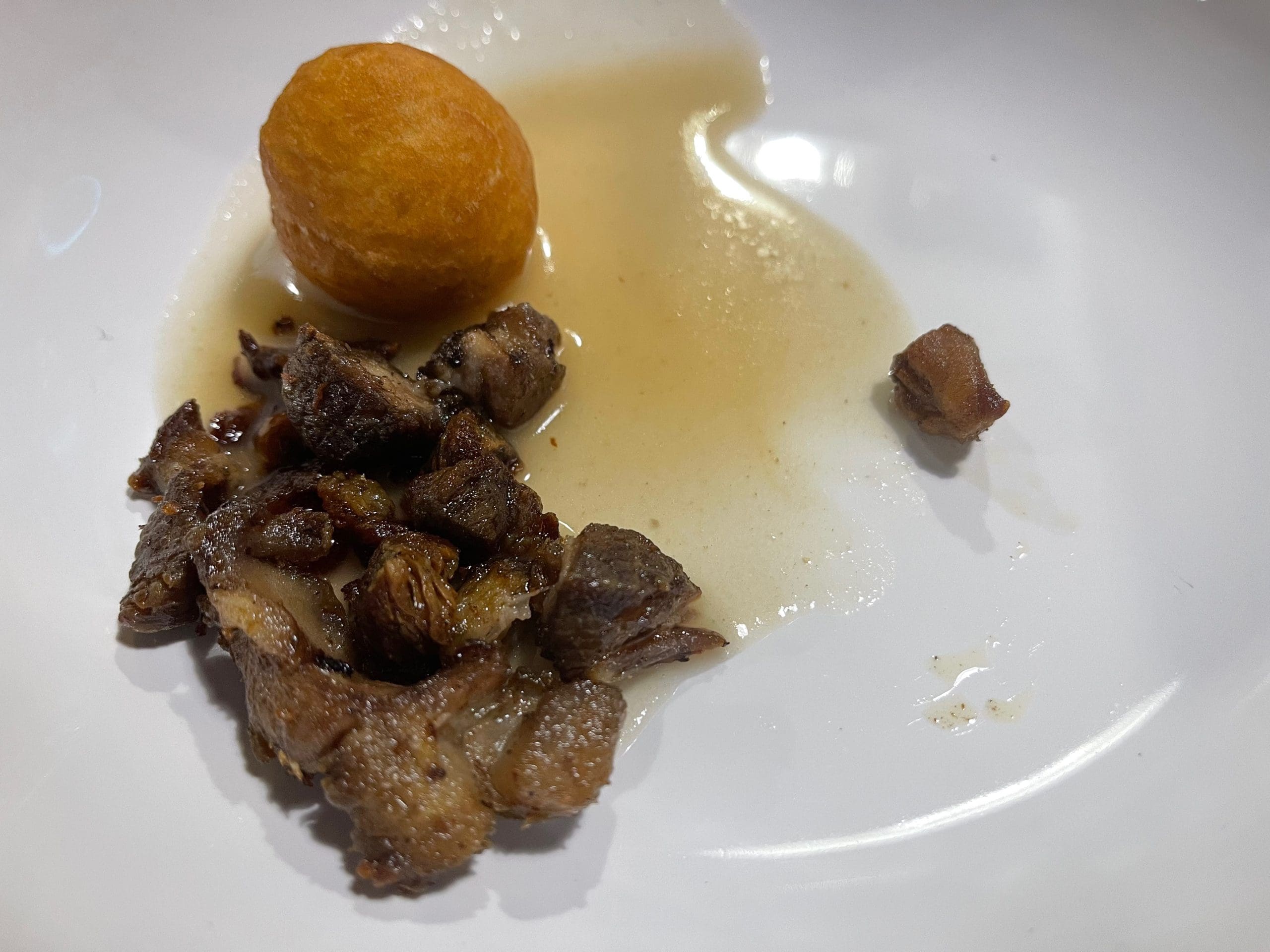 Justin’s reinterpretation of fry bread was much more palatable. Most of us think of fry bread as a plate-sized disk of shortening, flour and salt fried in grease or oil. Instead of the stereotyped disk-shaped fry bread (which Health magazine ranks as one of the fifty most unhealthy foods in the country), we were presented a dense orb more reminiscent of a “donut hole” than fry bread. It didn’t taste like a donut hole. It tasted like maybe the best fry bread we’ve ever had as confirmed by oohs and aahs a plenty. Fry bread was one component of the Steamed Corn Stew (fry bread, lamb, smoked salt), maybe not even the best. My favorite was the lamb presented in smaller than bite-sized pieces. If you associate lamb with gaminess, you’ll be surprised at just how mellow and delicious it can be when prepared by a chef-genius.