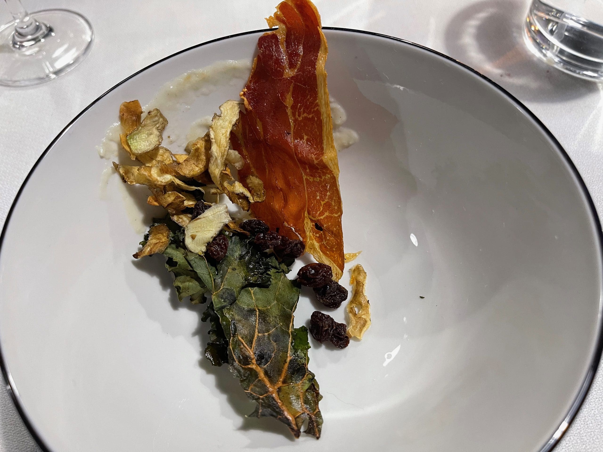 Although everyone at our table enjoyed every course, perhaps the one course eliciting the most enthusiasm was the sunchoke and chips (kale, prosciutto, hazelnut raisins). Only a few of us had ever had sunchokes in any manner. Also known as Jerusalem Artichokes (even though they’re neither from Jerusalem or from the artichoke family), sunchokes are actually the root of a species of sunflower plant which grows in New England. When baked into chips, they have an addictive, slightly sweet and earthy flavor. Sunchokes do not store starch. As such, they do not impact the body’s blood sugar level, which is great for those on a low “carb” diet. While sunchoke chips were the biggest hit, the crispy kale was also well received. Raisins offer a delightfully sweet contrast.