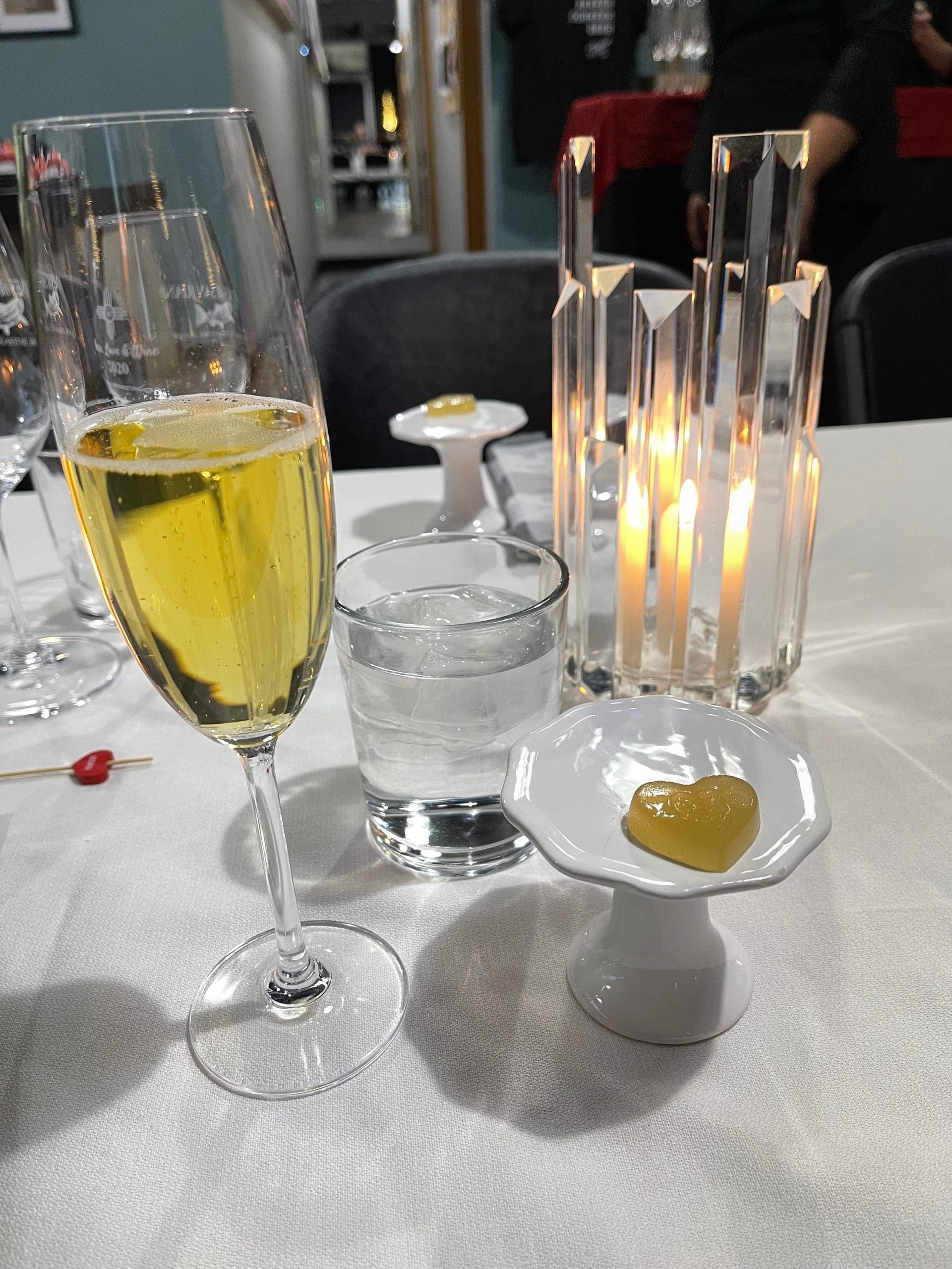 Each place setting on the table was resplendent with generously poured champagne flutes courtesy of Wines of the San Juan. For those of us who don’t imbibe adult beverages, sparkling cider and water were provided. Flutes and glasses were faithfully replenished throughout the evening along with an introduction of wines paired with each dish. Lit candles were further illuminated by unique glass candle holders reminiscent of major league baseball’s commissioner’s trophy. A single heart-shaped gelee (a French term for a jelly-like food) was placed on a small glass platform. Justin and Tia introduced the evenings proceedings followed by Justin delivering a blessing.