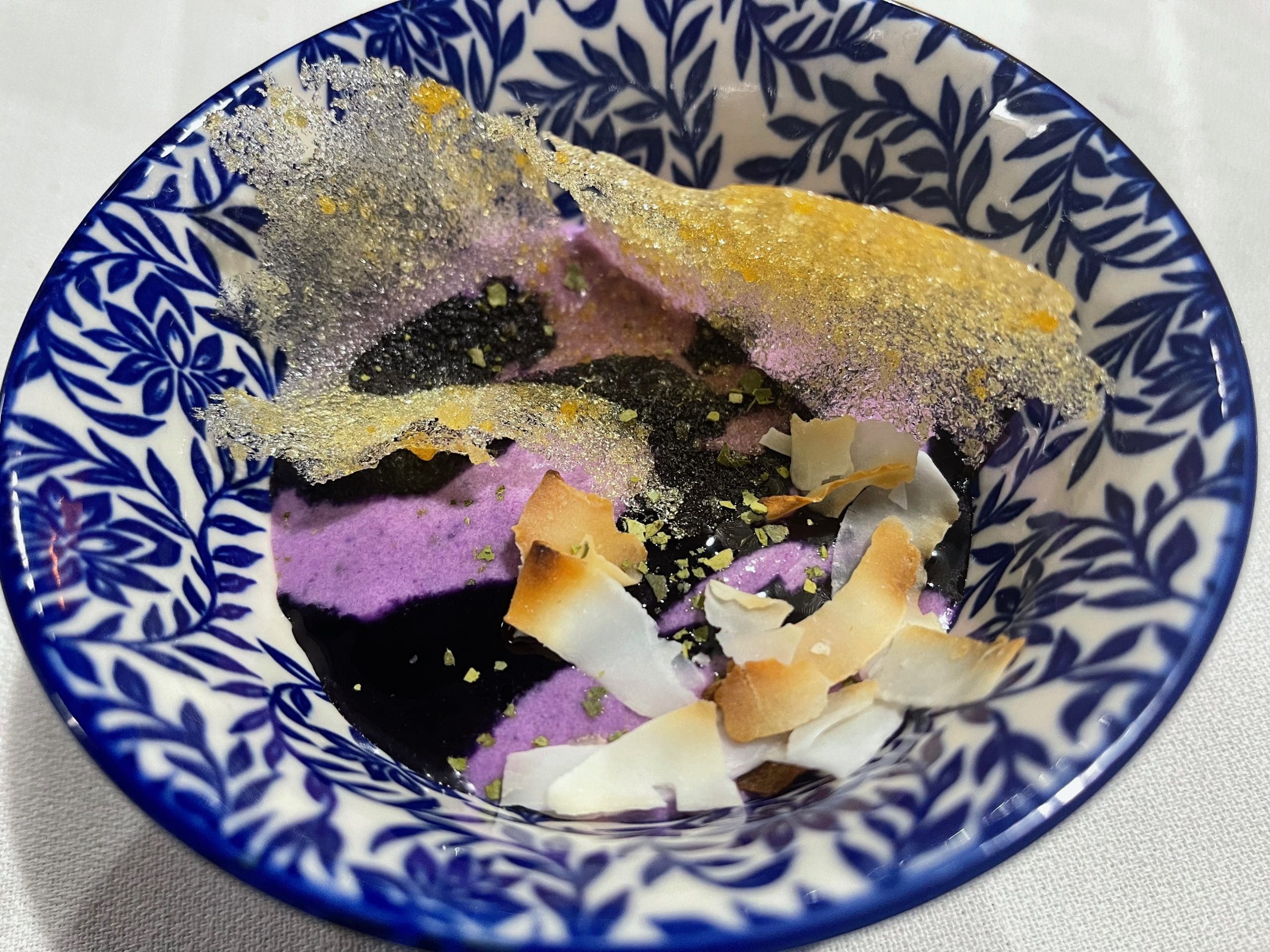 When it came time for the dessert course, some of us became melancholy in realizing the night would soon be over. To no surprise, the dessert course was also something with which few of us were acquainted, an ube ice cream (caramelized honey, coconut two ways, lime). Though often referred to as purple sweet potatoes, ube are yams with a dark, rough-looking skin. Ground into a powder, they are often used in Filipino desserts characterized by their bright purple color. Kudos to Justin for creating one of the most unique ice cream, one that captures the flavor essence of ube, a rich sweet taste with vanilla notes. Just as delightful as the ice cream was the caramelized honey, deep and rich in color and as intensely flavored as honey from a comb.