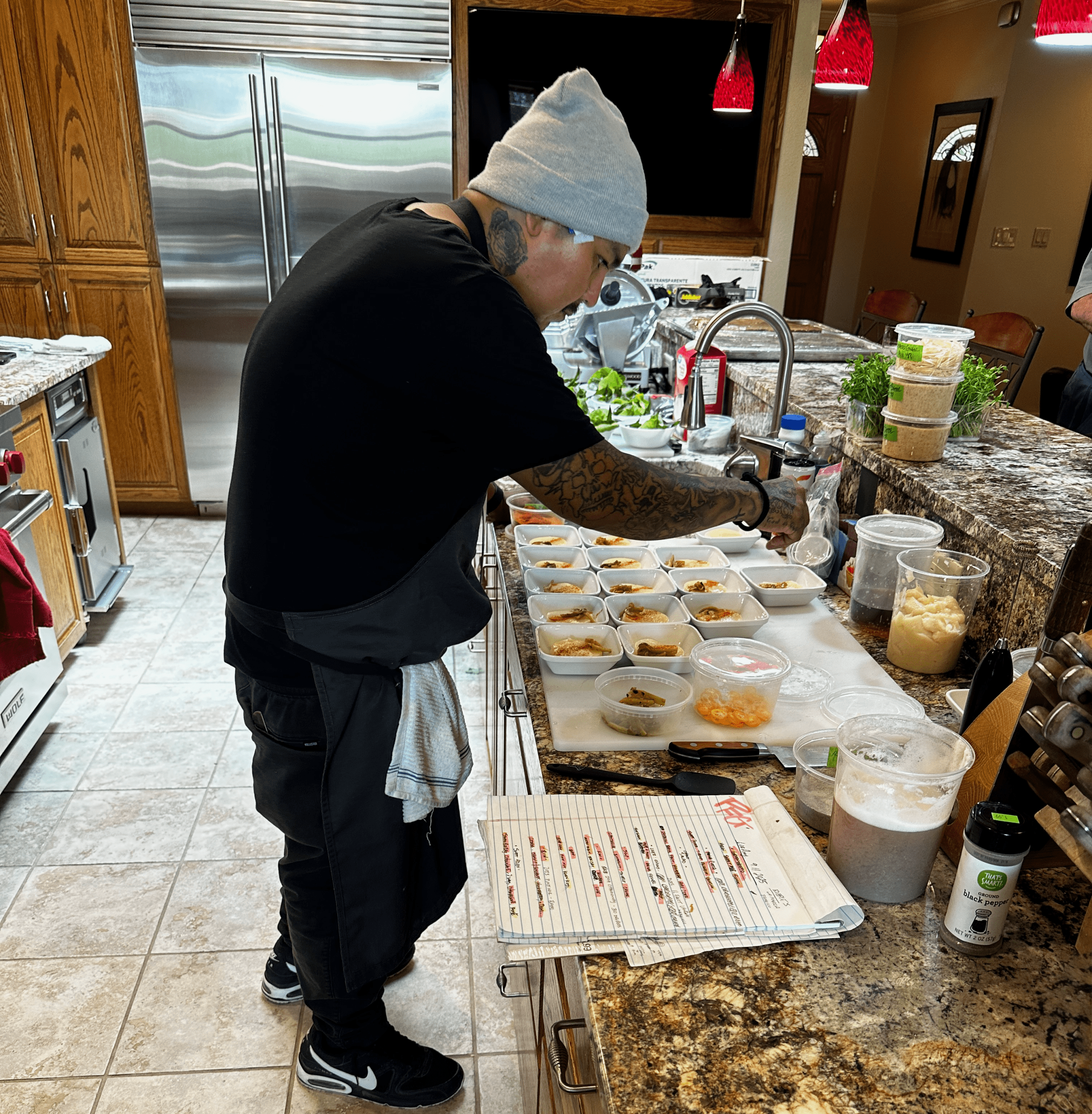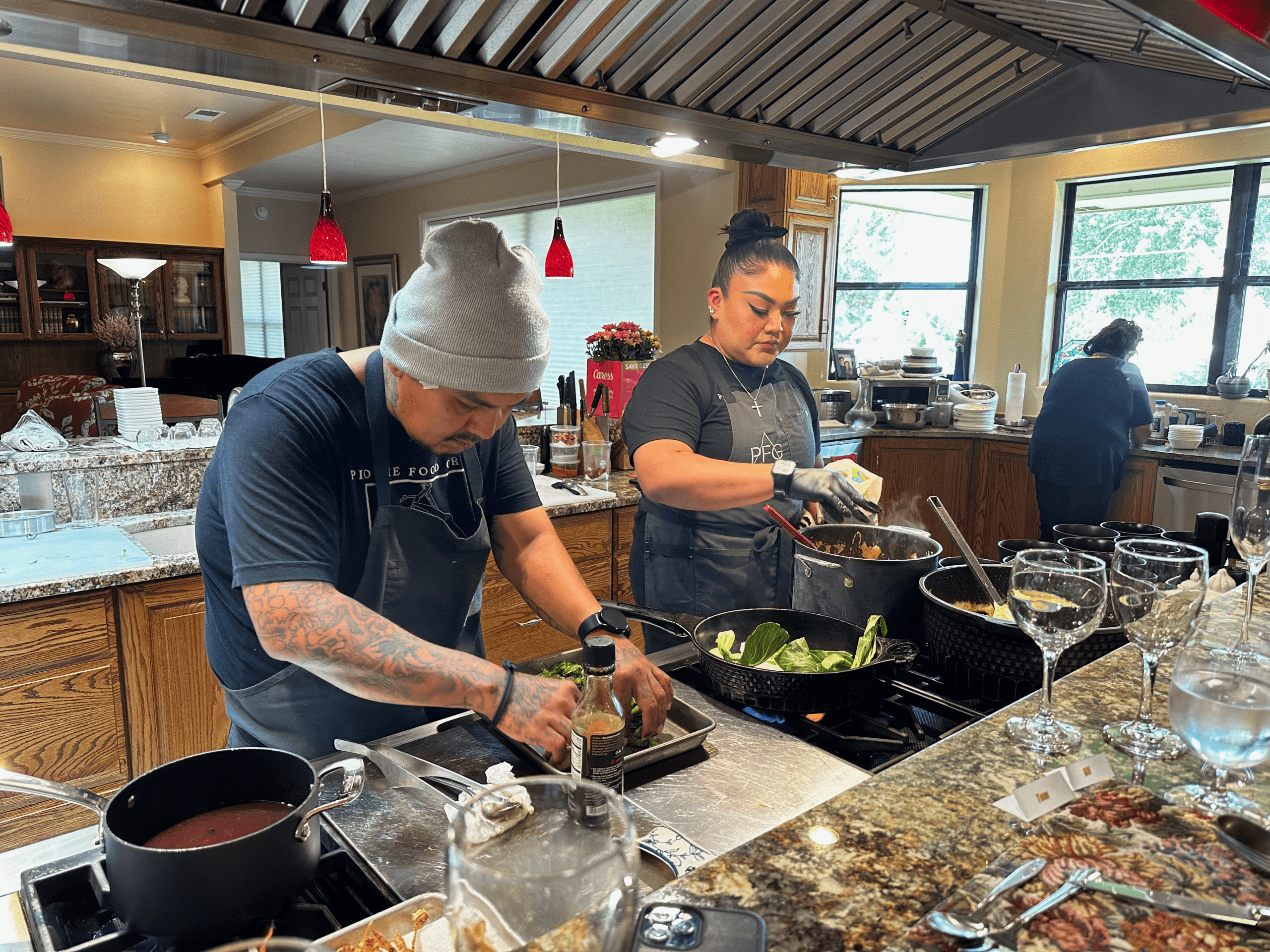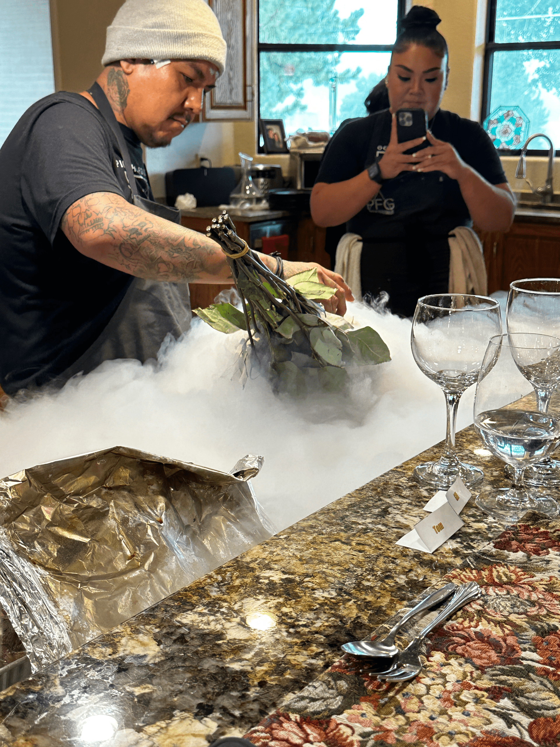 When Tom and I were discussing great restaurant meals in the Land of Enchantment, I told him about the LorAmy concept. (LorAmy is a combination of the chef’s grandmothers’ first names, fitting considering the matrilineal traditions of the Navajo). It intrigued Tom so much that he called his brother Greg and suggested we work together to plan a LorAmy event. Greg graciously agreed to host the event at his beautiful Farmington home. Our gregarious host seated me next to Tom on the bar overlooking Greg’s spectacular kitchen. The “best seat in the house” gave us ample opportunity to observe the family in action and to ask questions.