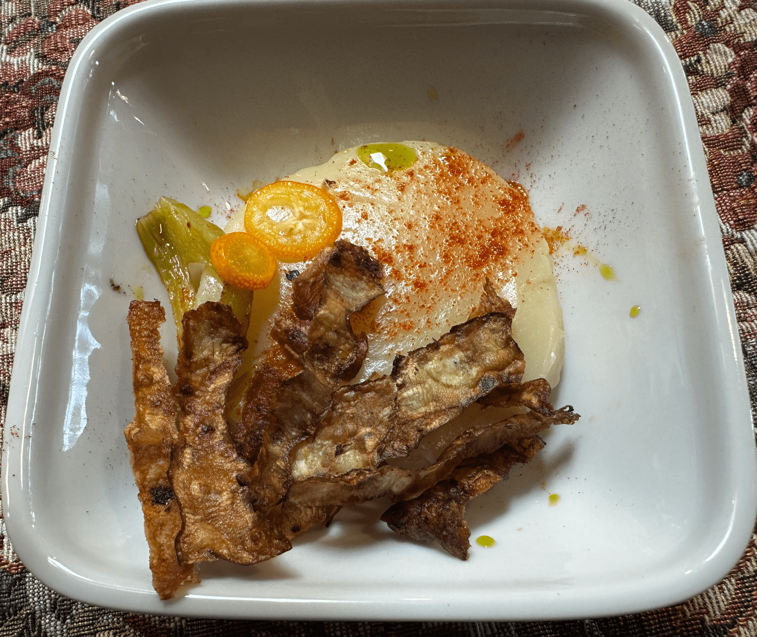 The Dééh may not have been everyone’s “cup of tea” (play on words here), but the second course more than made up for it. That course was a beautifully plated rectangular bowl of panna cotta. Most of us recognize panna cotta as an Italian dessert with a velvety-smooth and creamy texture. Literally meaning “cooked cream,” panna cotta can also be a savory dish as the Pioche’s version was. The cooked cream was essentially the essence of sweet potato with notes of turnip. Anaheim and Guajillo chiles added slightly fruity, piquant notes though this dish could hardly be called “hot” (even my chile avoiding bride enjoyed it). Plated with the panna cotta were sunchoke chips and heirloom kumquats.