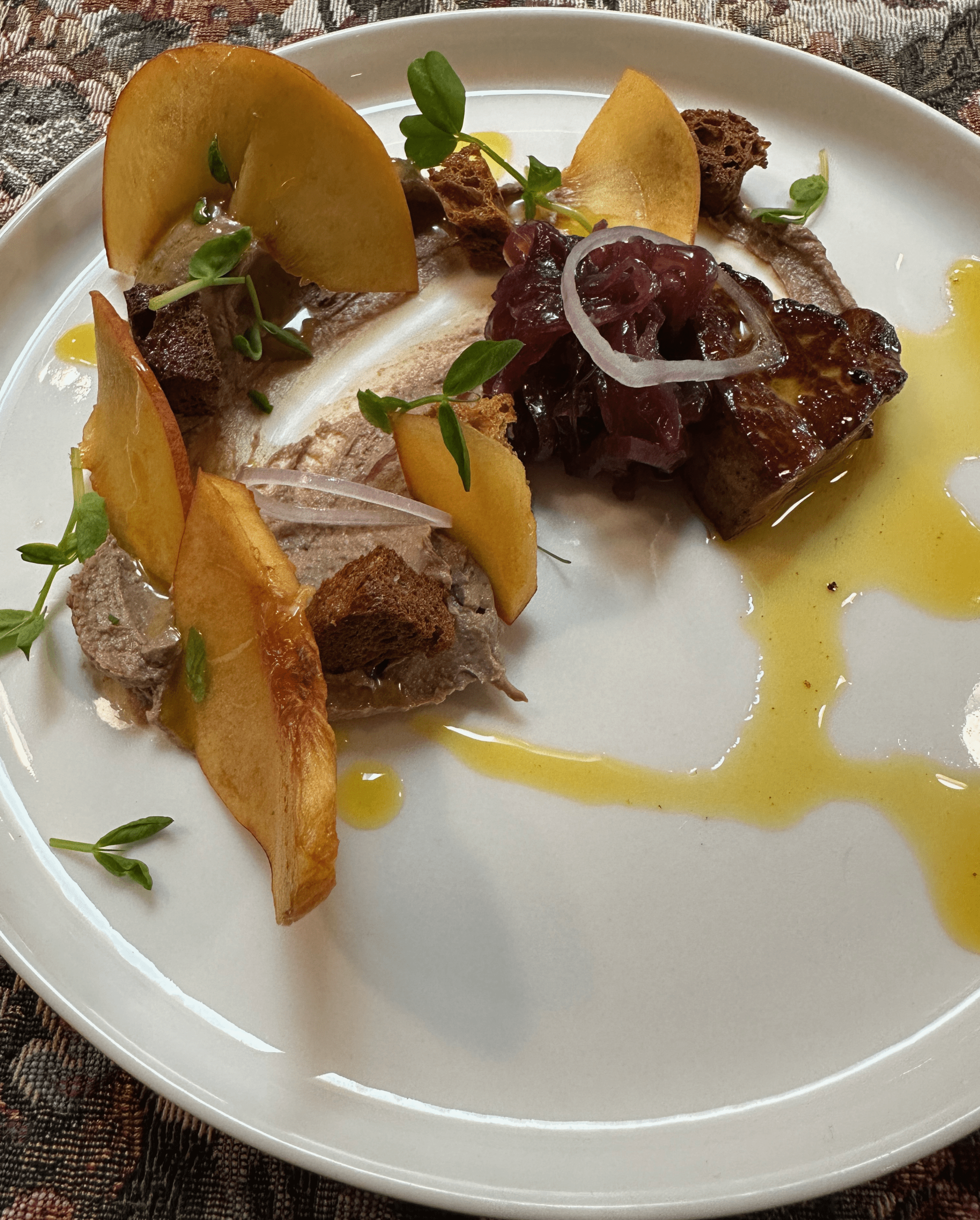 At the end of the meal, Janice polled guests to determine what their favorite dish of the event was. For many of us, the most transformative dish was the foie gras done two ways. Chef Justin introduced the dish as “Liver and Onions.” Our host Greg actually generously donated the foie grass (for which we owe him copious thanks). My favorite preparation style has long been as a pâté where its rich, buttery and delicate flavor and distinctive fatty consistency shine. The mousse-like pâté was superb! It’s much too rich to enjoy in copious portions, but it impressed itself on our taste buds for a long time. Tia’s contribution to this plate was an outstanding seared foie gras topped with fennel. Peaches, long the agricultural pride of the Navajo nation, provided a wonderful sweet-tangy counterbalance to the foie gras.