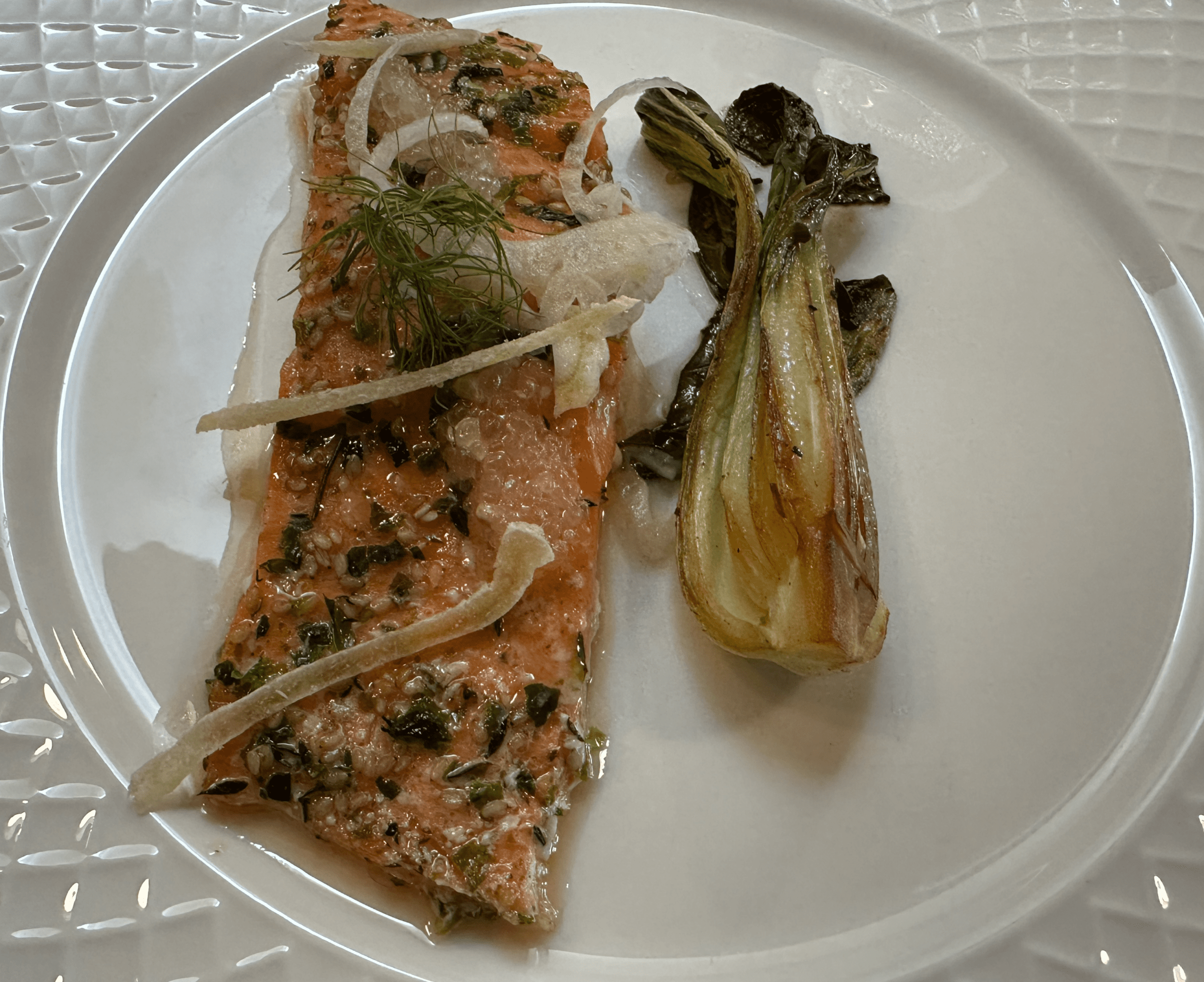 Tom was most excited about the ocean trout served with bok choy. It’s one of his favorite delicacies of the sea, one he enjoys every time he visits New Orleans. Ocean trout looks (a rosy pink-orange flesh) and tastes similar to salmon though it’s far less oily. It’s sweeter and milder than salmon with a delicate, buttery texture. Chef Justin prepares this rich, succulent and clean flavored fish with ginger and lime though not so much that it takes away from the briny qualities of the fish. Charred bok choy was a surprising though wholly complimentary, providing flavors (peppery, grassy, spinach-like) that work with ocean trout.