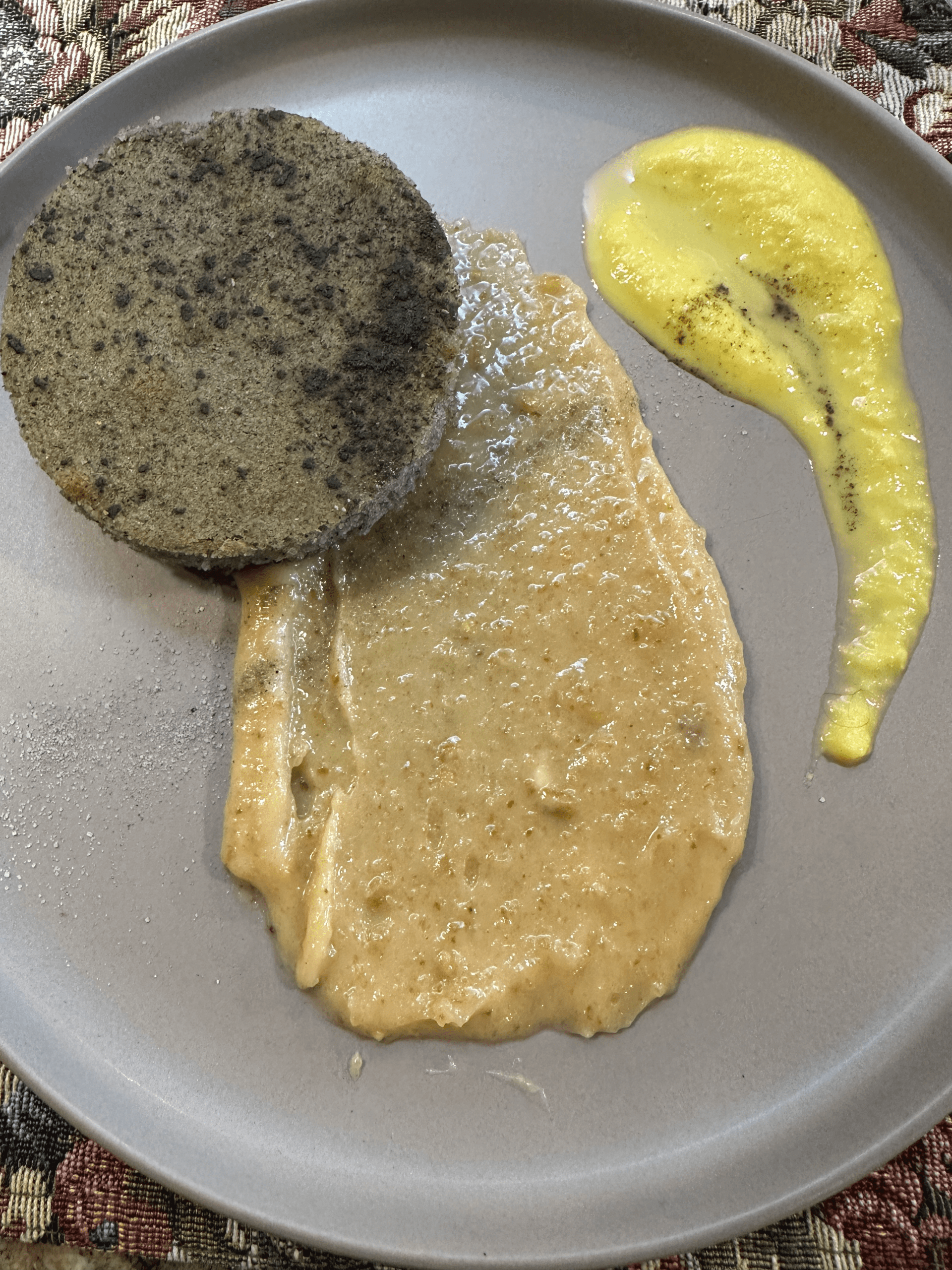 Few meals would be complete without a bread (Bááh) course. Though she doesn’t consider herself a baker, Tia’s bread courses are always a hit at LorAmy events. This isn’t the horno-baked bread or fry bread you might associate with indigenous peoples. For this event’s bread course, Tia created a circular blue corn bread plated with a smear of pine nut spread and a smaller streak of corn koji. The pine nut spread is sweet with a subtle hint of pine that will transport your mind and taste buds to New Mexico’s pine forests. The corn koji is a bit more challenging to explain. Koji is defined as “any grain that has been inoculated with the mold Aspergillus oryzae.” Essentially, koji can be made from almost any grain. Koji is a revolutionary approach to using grain molds to create absolute deliciousness. The Pioche’s corn koji exemplifies the chef’s creativity and constant study.