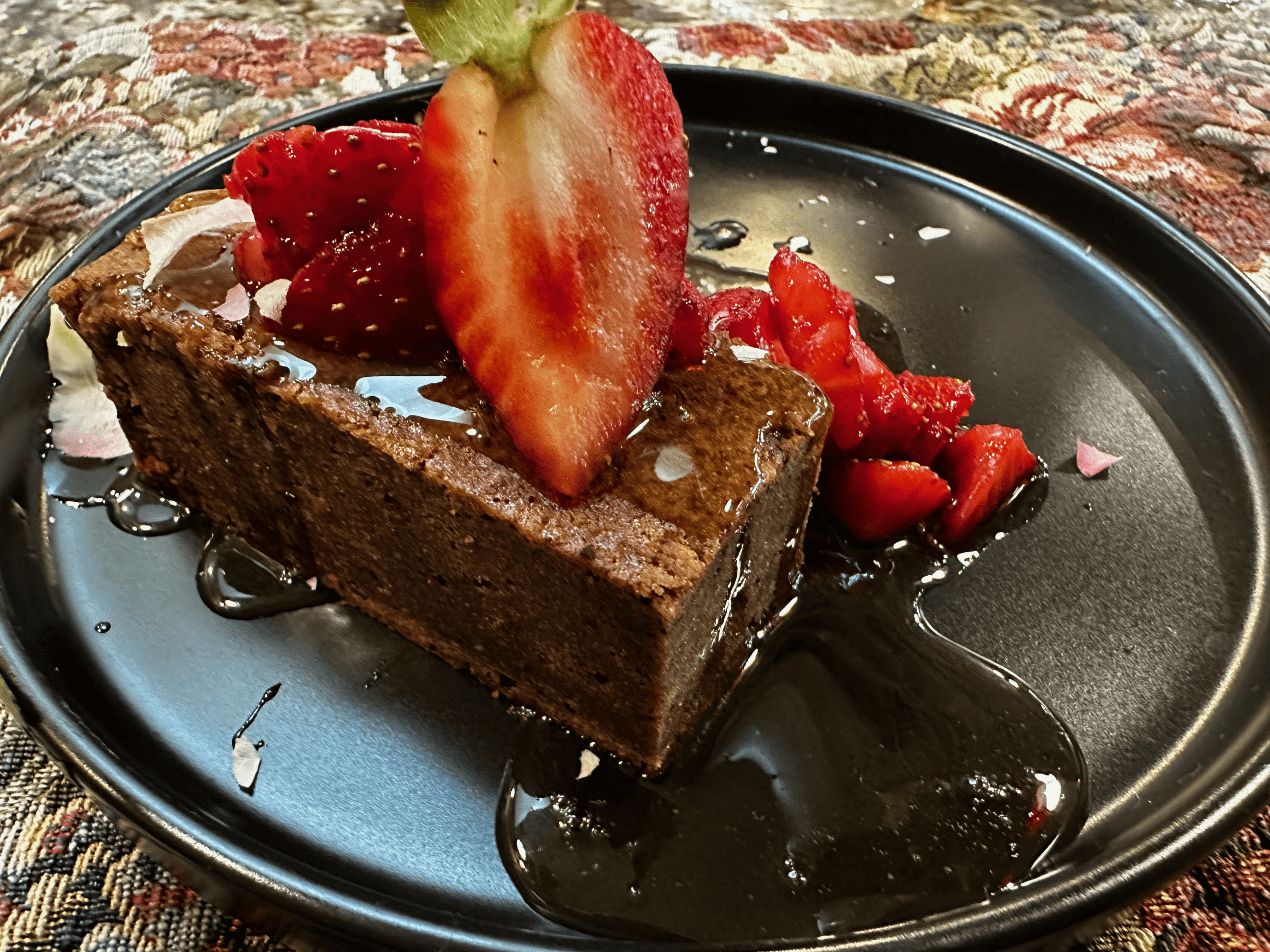 Fittingly, our final course was called Sweet Adieu. Chef Justin likened it to a sort of bread pudding, but it was wholly unlike any bread pudding of my recollection (and I’m somewhat of a bread pudding aficionado). This picturesque tart is chocolate two ways–in cake form and as a drizzle–topped with macerated strawberries. While not quite as sweet as Janice and Tia (what could possibly be?), this sweet end to a fabulous meal was a complex confection which won over ever heart in the place. Chef Justin used frozen nitrogen on a dozen long-stem roses as an entertaining and edible effect. The application of nitrogen was reminiscent of London on a foggy day. It brought oohs and aahs to our tables, but not as much as actually eating this decadent dessert.