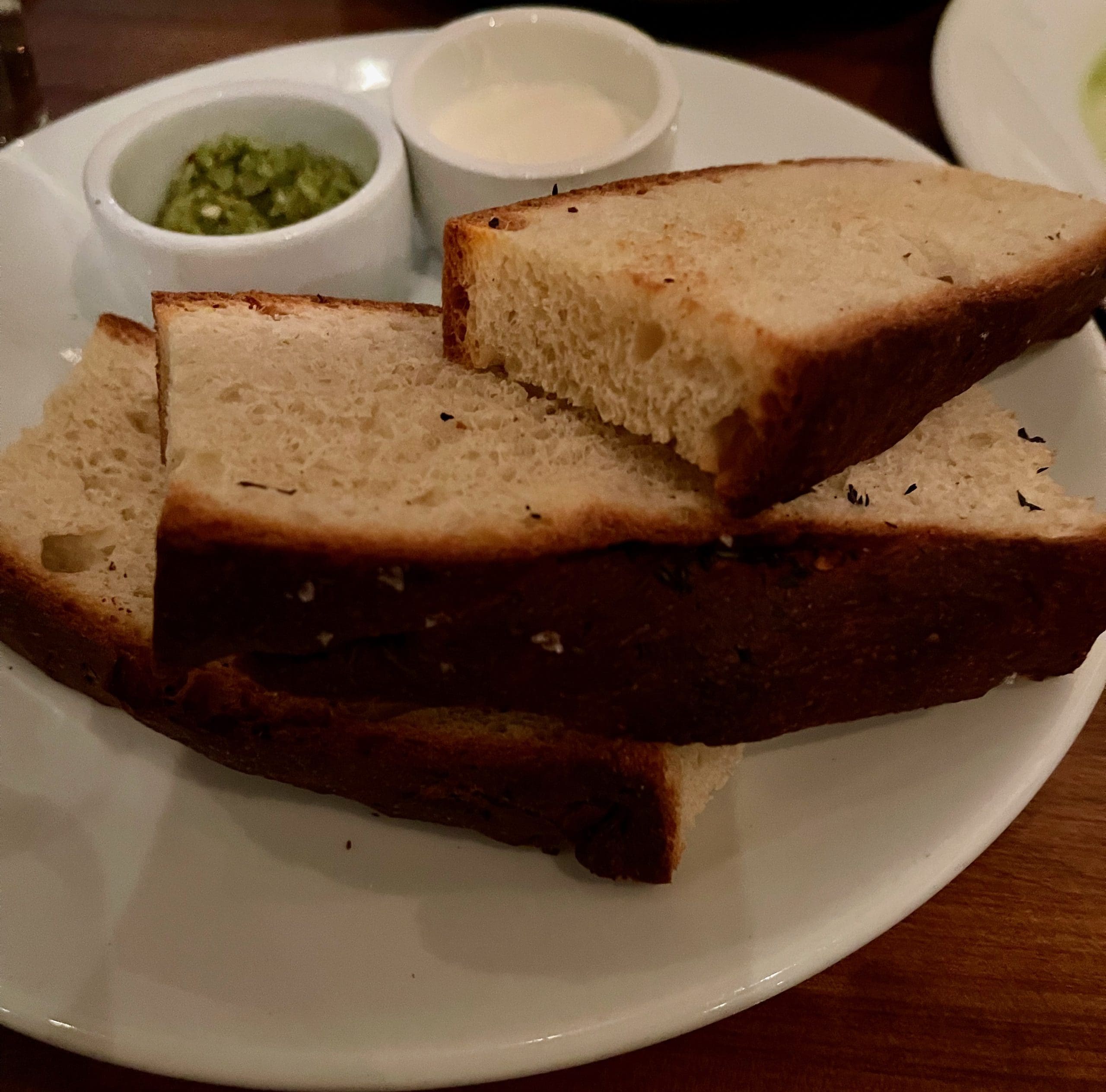 There are only four desserts on the menu, but there’s one for virtually every taste–including a vegan chocolate tahini torte. Bill and I both had the English toffee pudding. Remember, “pudding” in England is not nearly the same as “pudding” in the colonies. When Brits talk about pudding, they’re referring to an incredibly far-ranging number of dishes that don’t necessarily have commonalities. They can be sweet or savory and can be prepared in multiple ways. They can be stuffed or not and can be made with a wide variety of ingredients. Pudding is a very inexact dish, but then the United States and England are two countries separated by a common language. English toffee pudding is a type of a cake filled with chopped dates that’s covered in a bourbon caramel and served with a semi freddo.