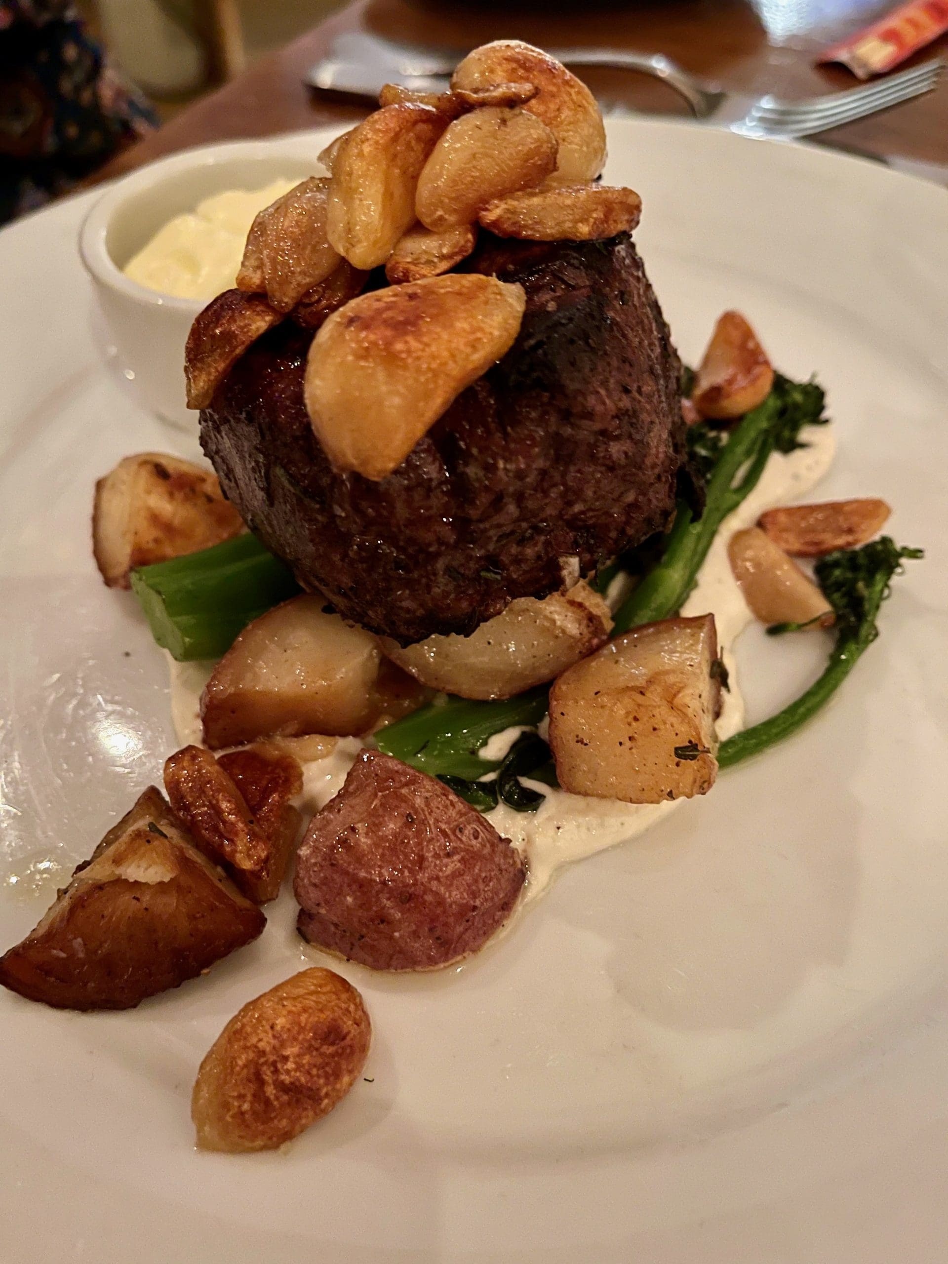 My Kim and Bill both had one of the day’s special, a six-ounce filet with oven-roasted new potatoes, a piquillo pepper coulis, broccolini and a gorgonzola sauce. The filet was so tender you could cut it with a butter knife. Prepared at my Kim’s exacting level of doneness (medium), her steak was pinkish and juicy throughout. Bill praised the broccolini, something he thought he’d never do. Broccolini is much sweeter and more earthy than broccoli. When it’s prepared correctly, it’s a wonderful accompaniment to meat dishes (or sandwiches). Both Kim and Bill thought the gorgonzola, usually a sharp and full-flavored cheese, was rather innocuous with not nearly enough of the blue cheese flavor it should have.