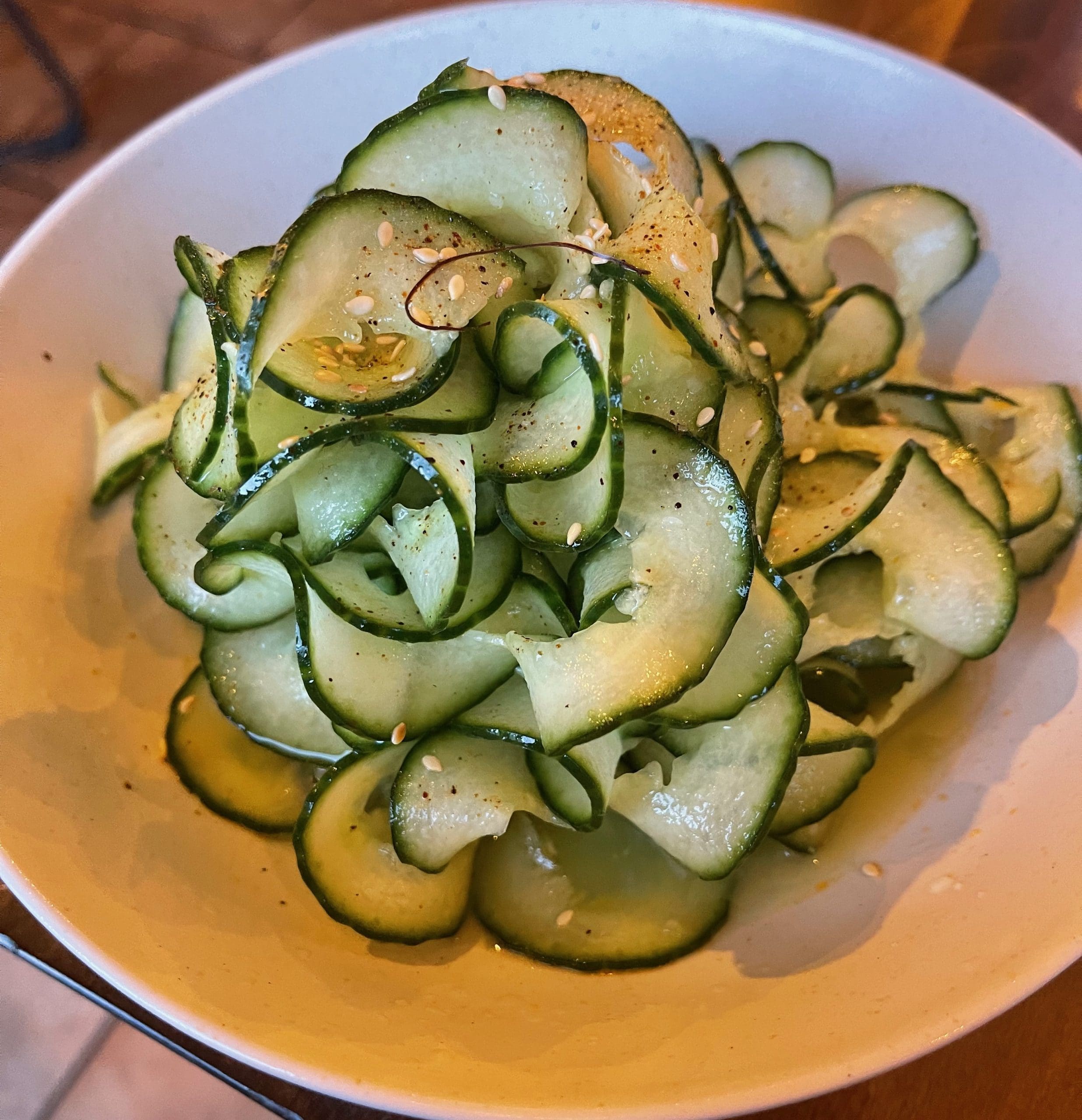 The first of our three botanas sports the name “Pepinos,” a term that translates from Spanish to “cucumbers.” In actuality, there was only one cucumber, but it was sliced so impossibly thin it reminded us of a fat apple that’s been peeled into just one long slice like a ribbon. The skill (and patience) to do that is remarkable. The menu indicated the Pepinos botana was vegan, but with one of the ingredients being “sal de hormigas chicatanas,” Steve pondered when and why hormigas chicatanas were classified as vegan. When we pointed it out to our server, he indicated the faux pas was caught after the menu had gone to print. Hormigas chicatanas, by the way, are a species of large flying ants considered a rare seasonal delicacy from Oaxaca.