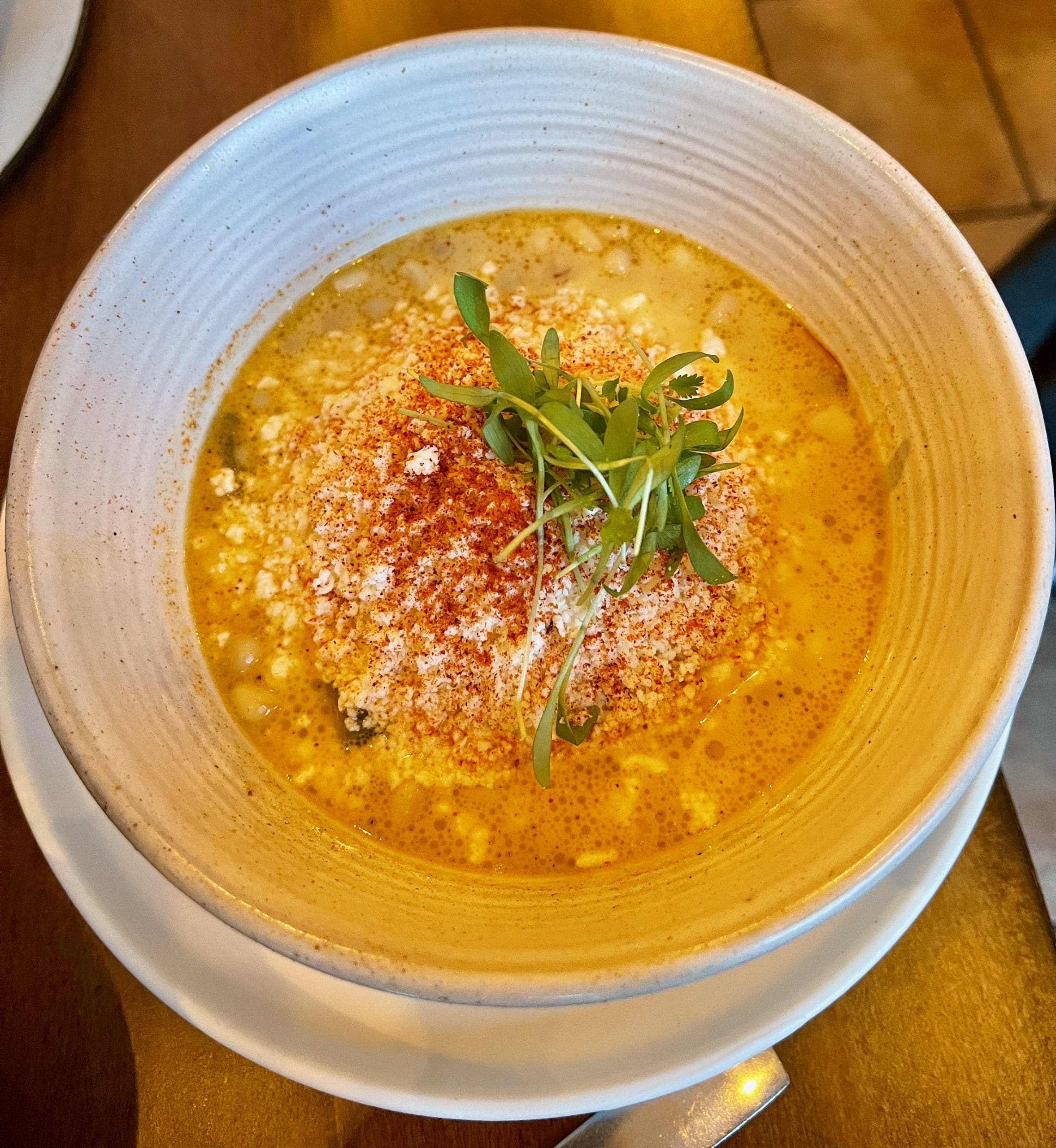 Because of my Kim’s sensitivity to piquant foods, our server pointed out “safe” foods for her to order. Among them are the papitas fundidas (roasted baby potatoes, quesito fondue, local full circle mushrooms, chorizo, avocado salsa). We’ve had a few thousand portions of queso fundido over the years. This botana is a highly elevated version of the fabulous Mexican cheese dip (which, by the way, is at least a thousand times better than con queso). A layer of bubbling molten queso blankets the amalgam. Salty and stringy, the queso infiltrates every element of this composition, elevating the papas and melding with the mushrooms to bring a bit of joy with every bite.