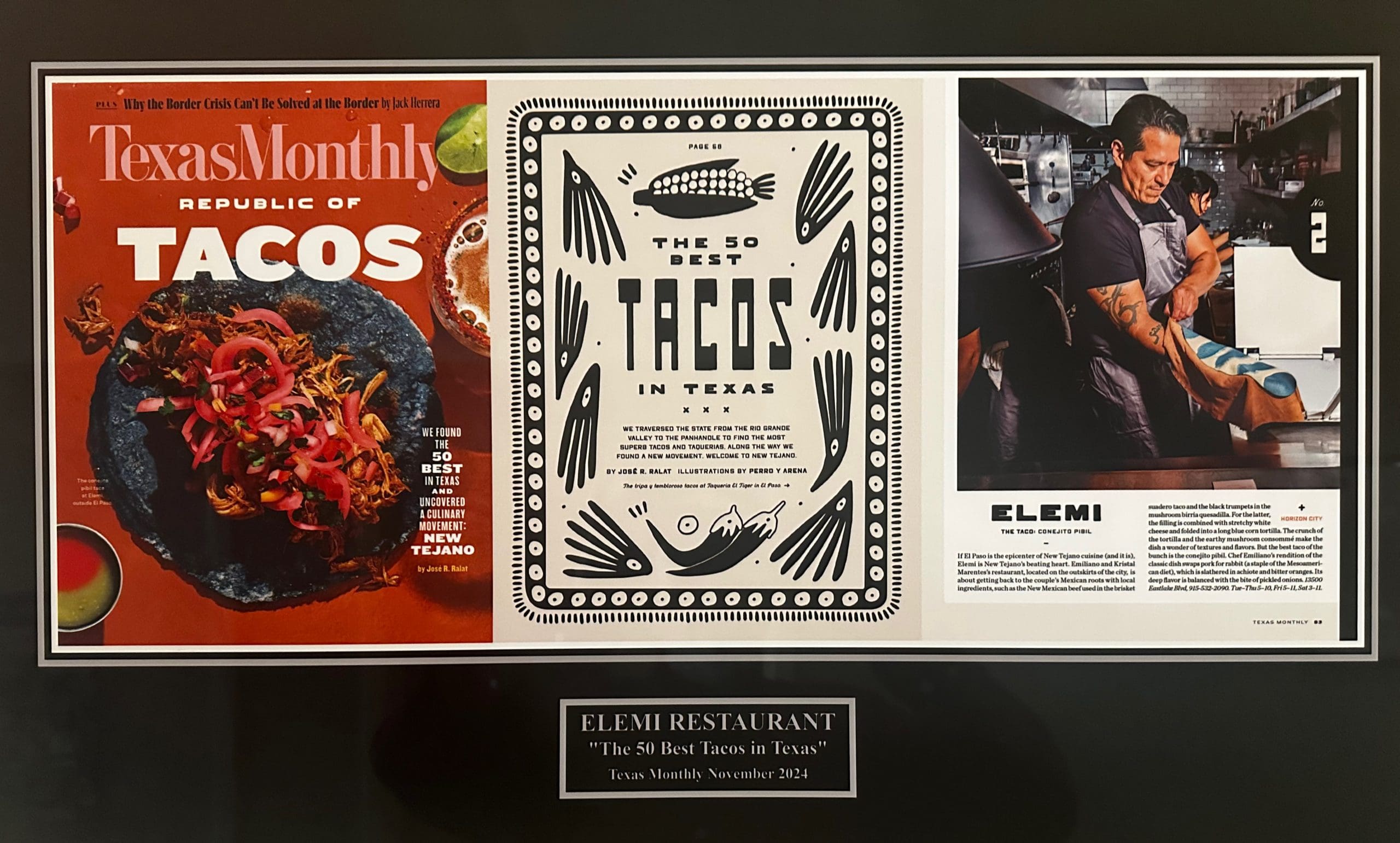 In the two years between visits, Chef Marantes was a James Beard Foundation “Best Chef – Southwest” finalist twice–in 2022 (after our visit) and in 2023. As of this writing he is a three-time semifinalist with finalists yet to be determined. Perhaps as significant (especially if you’re a Texan) is that in its “50 Best Tacos in Texas” feature, Texas Monthly Magazine declared ELEMI home to the second best tacos in Texas. Considering, the Magazine’s “Taco Editor” Jose Ralat visited some 1,200 taquerias over a distance of 14,000 miles, that’s a formidable accomplishment. Ralat indicated “If El Paso is the epicenter of New Tejano cuisine (and it is), Elemi is New Tejano’s beating heart.”