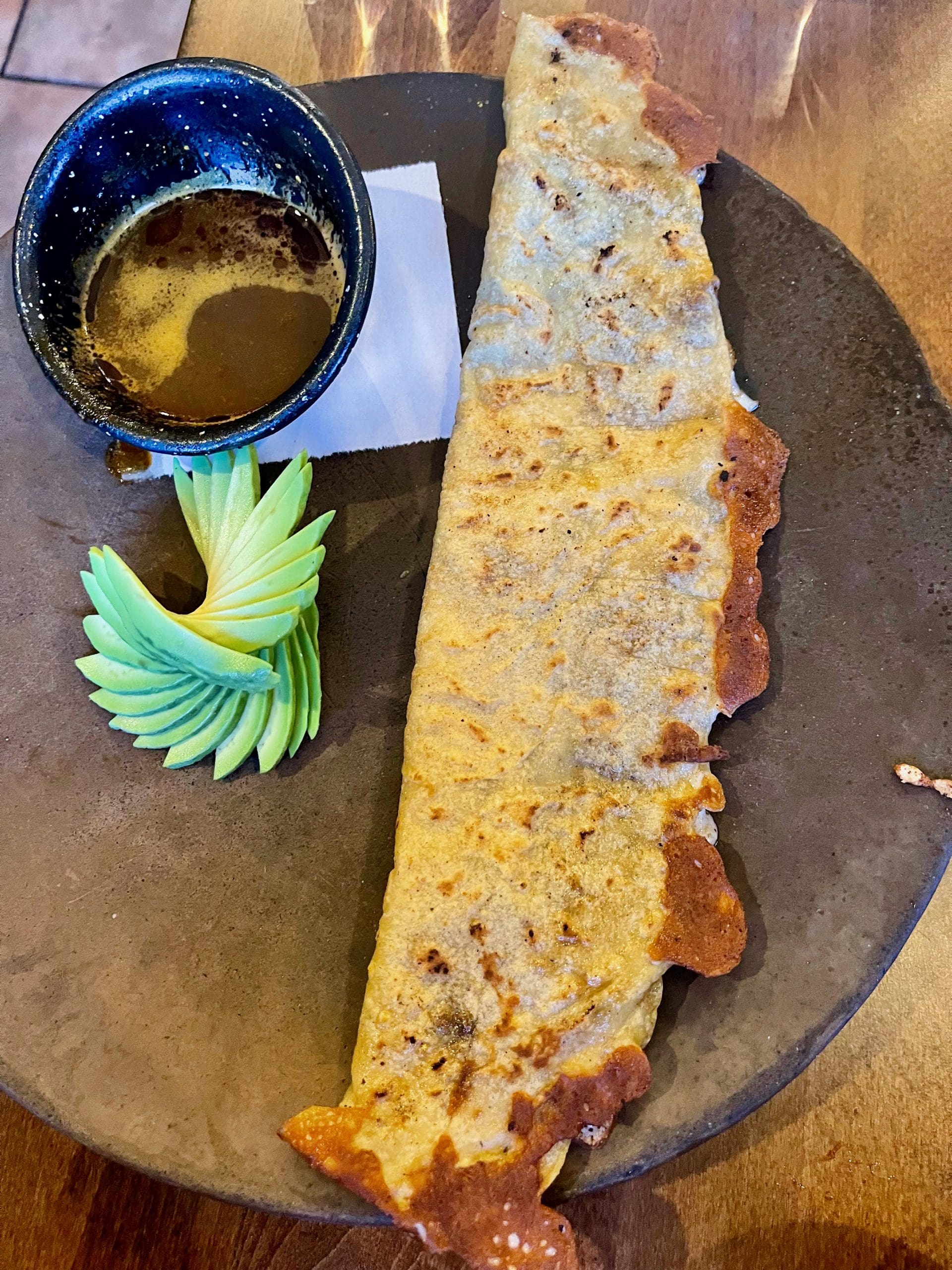 Our third botana was a unique take on quesabirria. When it was delivered to our table, I thought it was stuffed crepe. Quesabirria, as everyone in America now knows, is a portmanteau, a compound word joining queso (cheese) and birria, the traditional Mexican stew. Essentially quesabirria is. a beef birria taco with melted cheese, a sort of cross between a taco and a quesadilla. Typically quesabirria is served with a rich consomme. ELEMI’s version is mde with local black trumpet mushrooms, birria style mushroom broth, quesillo and avocado fanned out. This is wholly unlike any quesabirria either of us had ever experienced. In so many ways, it may have been better, especially if (like me) you’re a mycophile.
