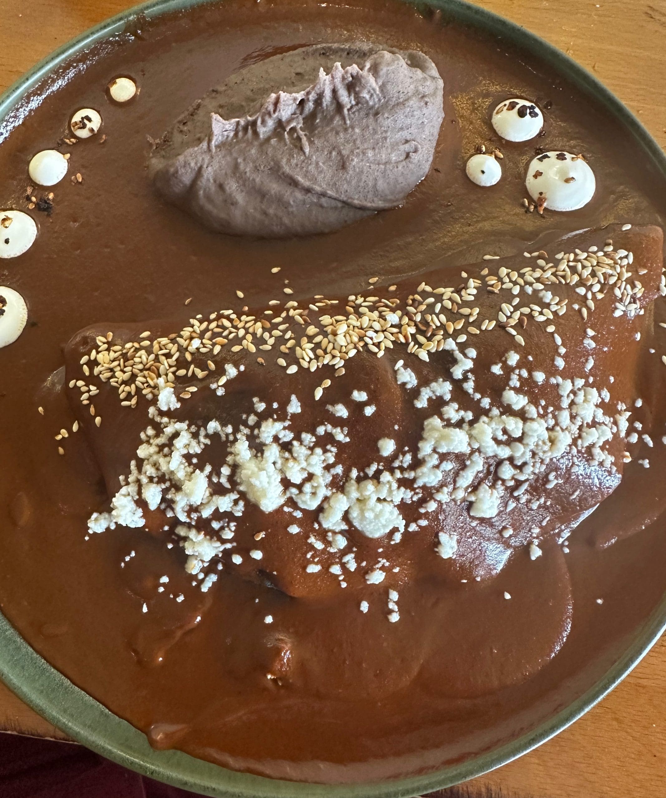 Recognizing the size of the platos fuertes, Steve and I decided to share the enmolada (24-hour brined roasted chicken, mole coloradito, black bean refritos, crema). We both love mole, a term derived from the Nahuatl mōlli, meaning “sauce.”As Texas Monthly’s “Taco Editor” Jose Ralat explains “mole is not just a sauce. It is the entire main dish.” Further, he praises it as ” one of the most sought-after and beloved Mexican dishes. It’s considered one of the best expressions of traditional Mexican gastronomy, if not its pinnacle.” He stresses that “Contrary to popular belief, most preparations of the classic dish don’t include chocolate.” Indeed, it’s one of the most diverse–and delicious–dishes you can have.