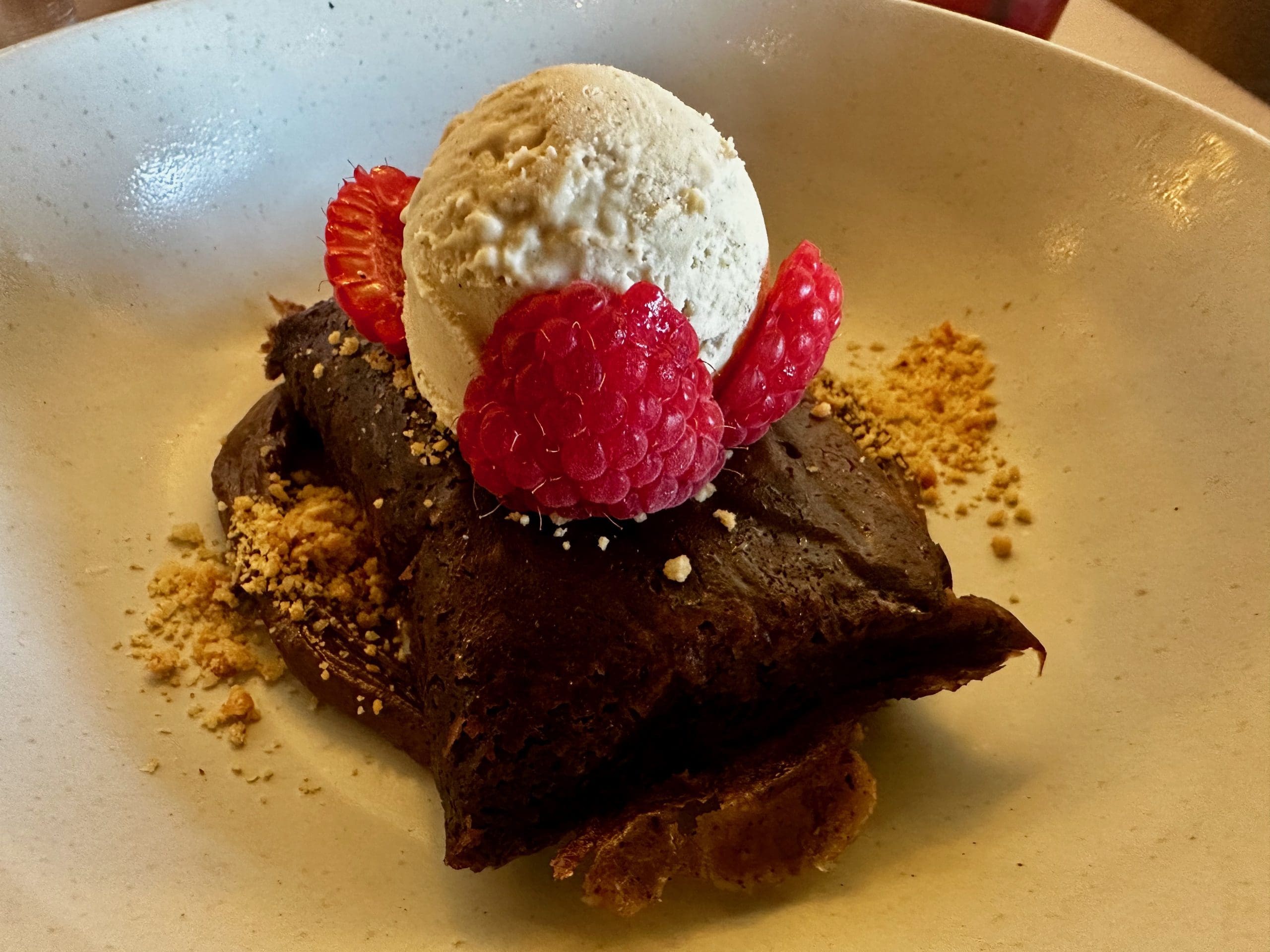 Not that the chocolate tamale is any consolation prize. This tamale wasn’t wrapped in corn husks or banana leaves. Instead, it is presented as a dark chocolate cake resembling a brownie topped with a single scoop of ice cream and a raspberry. It was a good dessert, but 20/20 hindsight tells me the arroz con leche would have been fabulous. That’s how I felt in 2023. Two years later, I advised my Kim to order this terrific tamale. She loved it, maybe especially the banana ice cream.