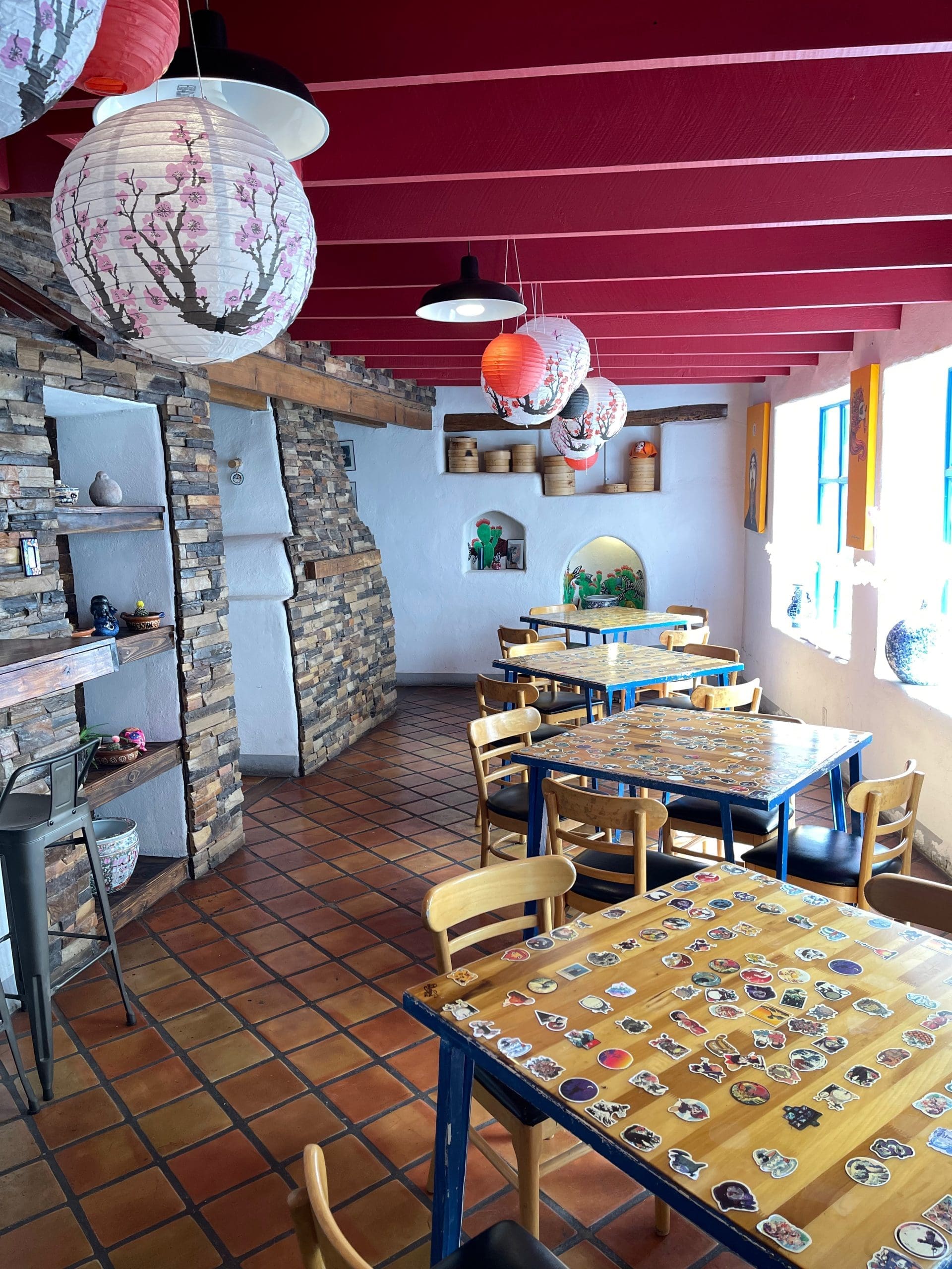 A framed painting on the front dining room wall may at first bring to mind a diner spewing his (or her) lunch, but on closer investigation, that diner is endeavoring to slurp up a large tangle of noodles. It’s all in great fun. So is the culinary fusion of Asian (primarily Japanese) cuisine with the Mexican food so prevalent in the area. El Charlatan is definitely where you want to go to transport your senses to two continents at the same time. It’s where you want to go for an unpretentious meal constructed entirely of high-quality, fresh ingredients. It’s not just a “foodie” destination. Every diner will find much to love from a menu showcasing tacos, baos and a phalanx of other fantastic fusion foods.