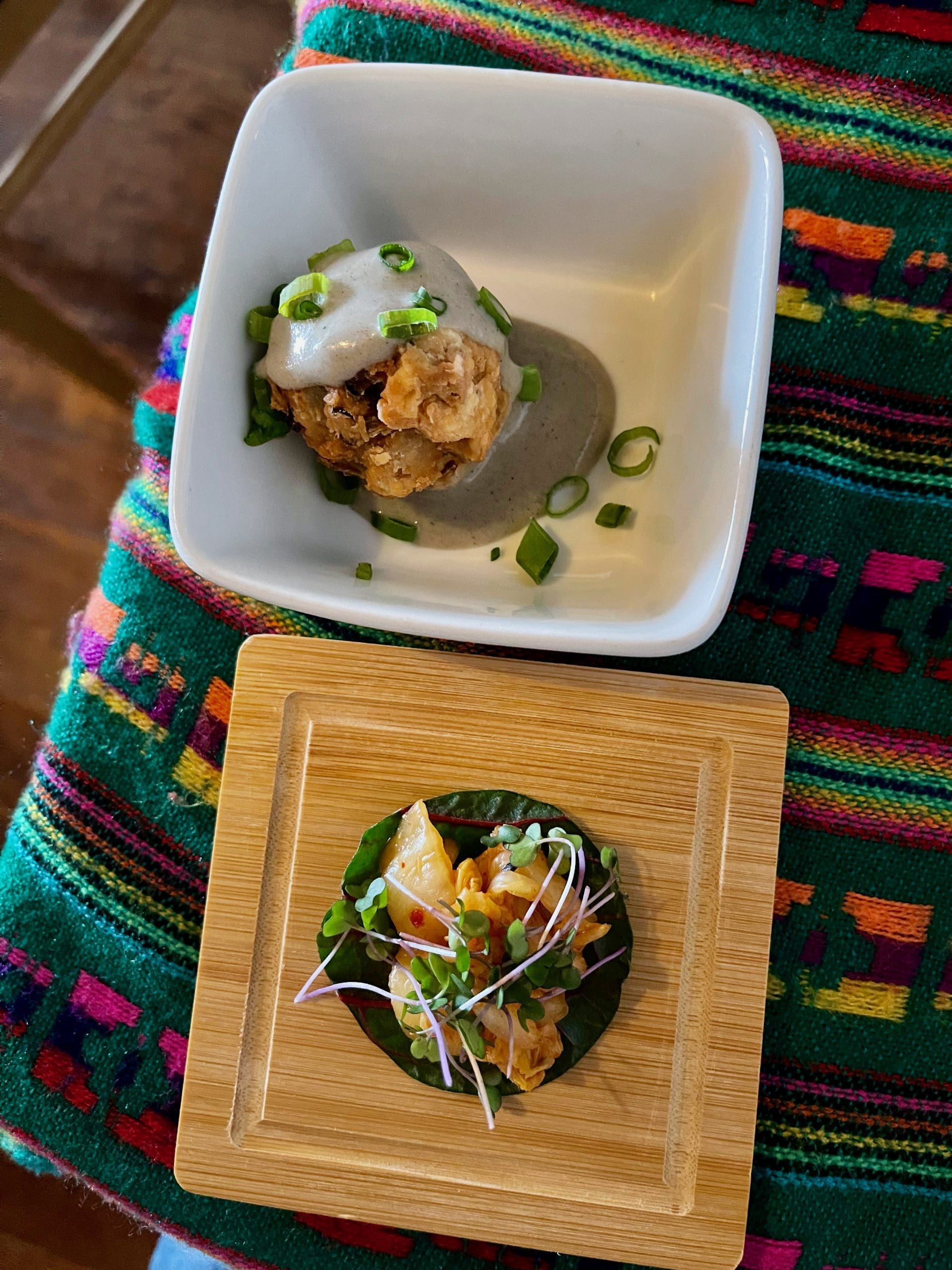 We joked that El Charlatan might be doing a disservice to its business by not only serving complimentary tortillas and butter, but an amuse bouche as well. Amuse bouche, a French term for a small savory item of food served as an appetizer before a meal, are a staple at some fine-dining restaurants so why not at El Charlatan? Our amuse bouche was a medley of magnificent mouth-pleasing ingredients atop a delightful sweet onion croquette (and the only three I can remember are gochujang, tempura crumbles and scallions). Chef Lozano’s use of gochujang is on display throughout El Charlatan’s amazing menu. The gochujang, a savory, sweet, and spicy fermented Korean chile paste condiment was just a bit too incendiary for my Kim so I had two of these amazing (sadly nameless because my memory is terrible) amuse bouche.