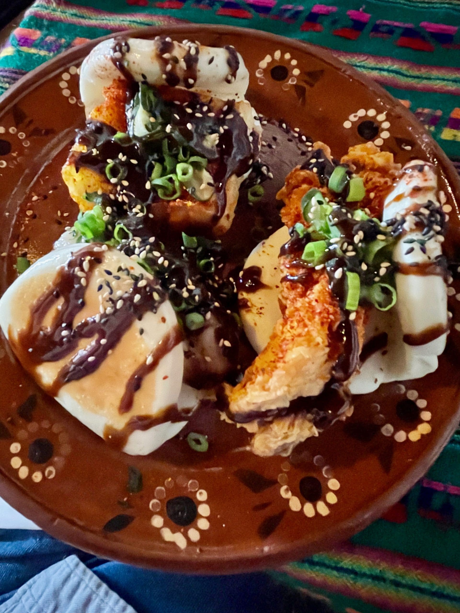 Despite having ordered the chef’s tasting menu, my gluttony apparently has no limits. I still wanted to share in the bao trio: pork belly bao (a steamed bun filled with pork belly and pickle, this bao is topped with toasted sesame seeds and hoisin sauce); fried chicken bao (a crispy buttermilk-fried chicken sits in a steamed bun. Paired with picked and topped with togarashi, hoisin and toasted sesame seeds); and Tempura tofu bao and pickles in a warm, steamed bun, topped with togarashi and hoisin sauce. The three bao were served in a decidedly Mexican plate not the bamboo basket we expected.