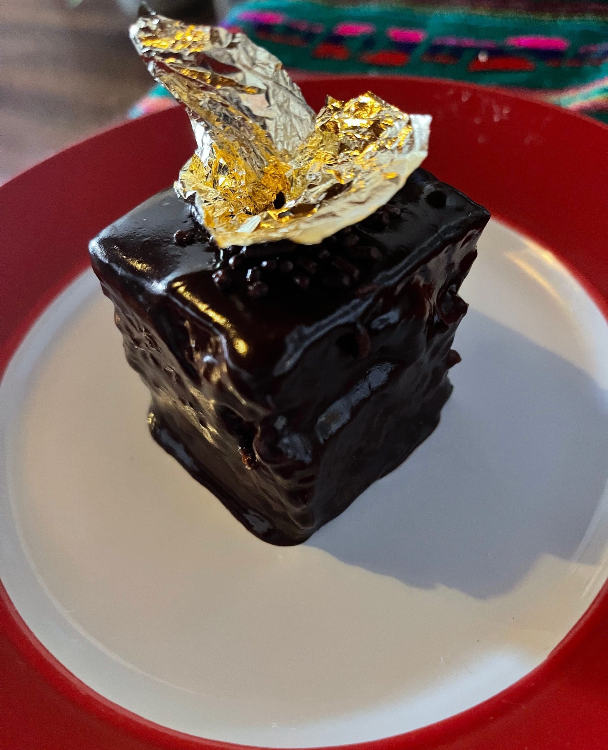 The first of two desserts was El Ganzo (vanilla-nori cake with grilled strawberry jam, soy meringue topped with chocolate glaze, chocolate sprinkles and edible gold foil). In the vernacular of Northern New Mexico, El Ganzo translates from Spanish to “The Turkey,” but there’s nothing turkey-like about one of the very best desserts to ever cross my lips. The edible gold foil is strictly show; it adds nothing to the deep richness and flavors of a multi-level cake. Neither my Kim nor Steve had ever tried gold foil. Neither was impressed. El Ganzo was inspired by a Mexican snack caked called Gansito. It’s rare that a dessert captures my affections nearly as much as savory items, but this is one special dessert.