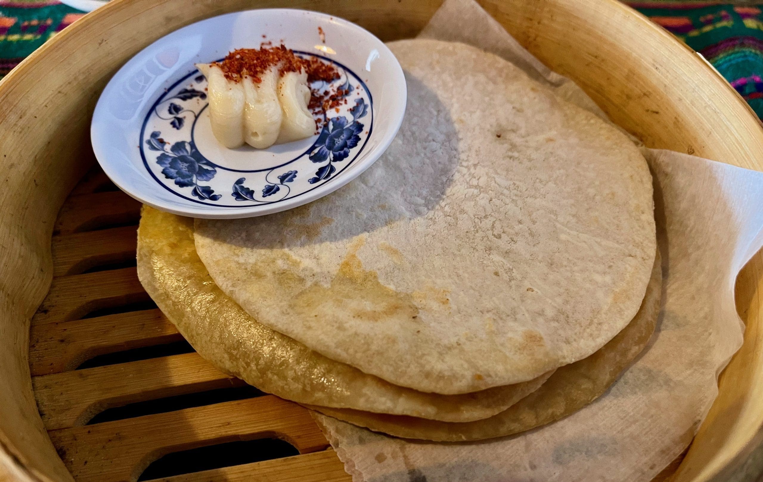 As we perused the menu, Louie ferried over a bamboo basket similar to what Chinese restaurants use for plating dim sum dishes. Instead of Chinese “touch the heart” specialties, the basket contained three handmade flour tortillas accompanied by fresh butter from Licon Dairy, a must-visit working dairy just a few miles from El Charlatan. The fresh butter was infused with miso and Asian spices. The butter was so good, we should immediately have ordered the Licon cheese platter. We did trek to the Dairy where we stocked up on Chihuahua, Asadero and Requeson cheeses. In retrospect, we should have asked if the butter was also available at the dairy.