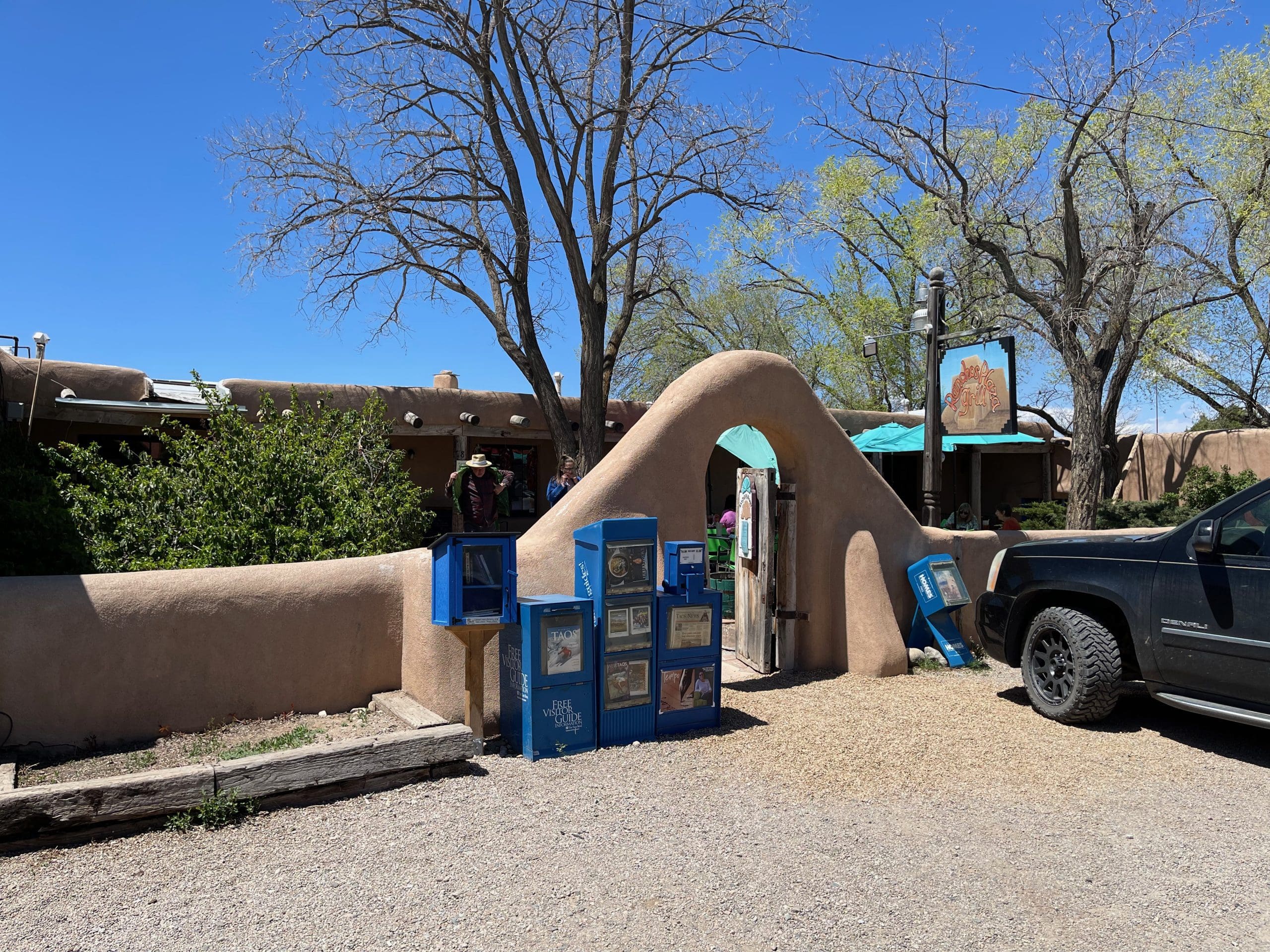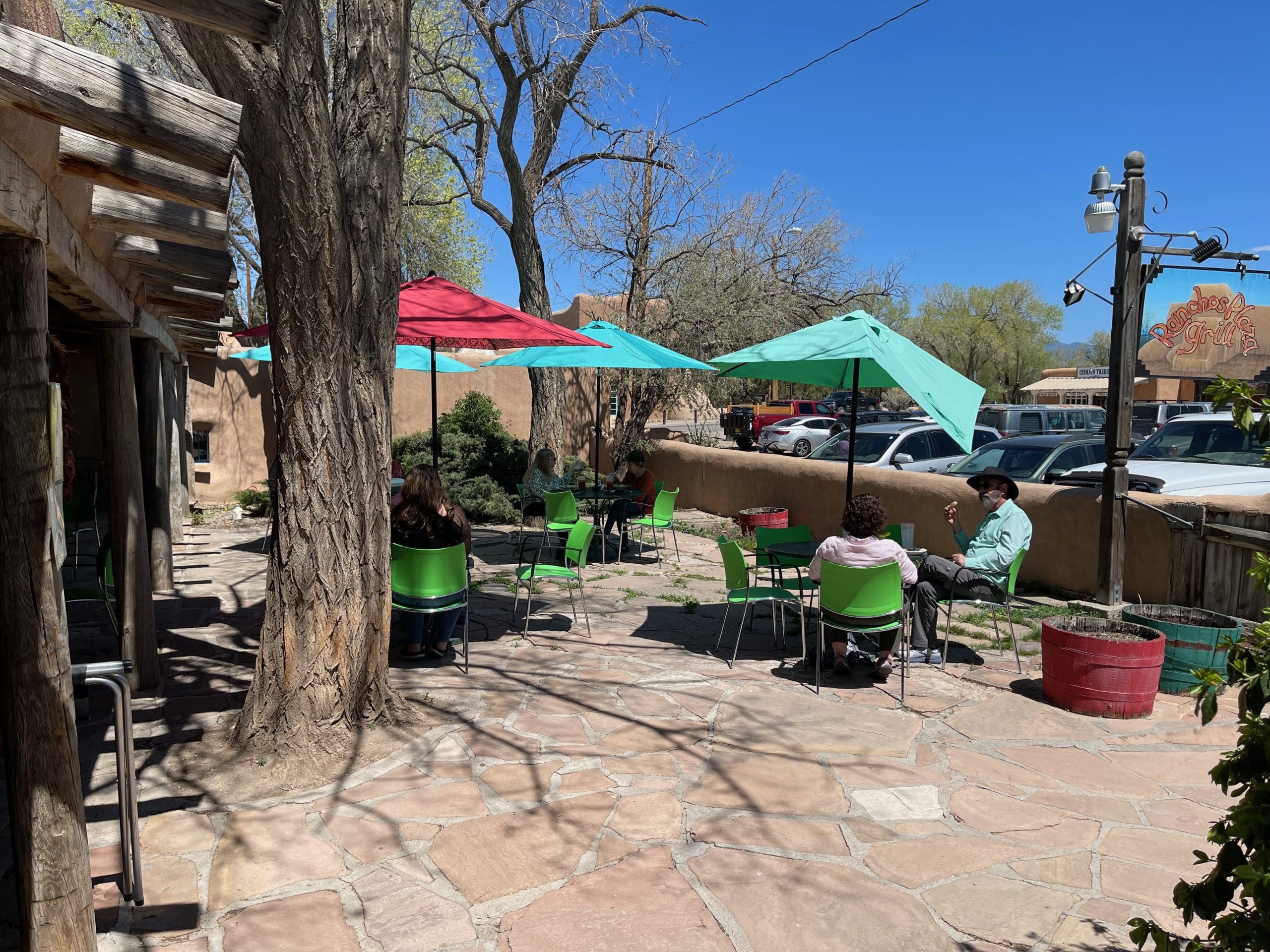 Today much of what was once a central open area is a parking lot facing the back of the San Francisco de Assisi Mission Church, a large, sculpted Spanish Colonial church with massive adobe buttresses and two front-facing bell towers. The contiguous houses built around the once central open area are now occupied by art galleries, small shops and the Ranchos Plaza Grill, one of the premier New Mexican restaurants in Northern New Mexico. From the Grill’s north-facing open-air patio, your views afar are of spectacular snow-capped mountains, including Wheeler Peak, the highest mountain (13,127′) in New Mexico. Towering deciduous trees provide sun-shielding shade and lend to the beautiful ambiance. For al fresco dining, you can’t beat it…and you might just be tempted to abscond with the beautiful red chile ristras hanging on the patio.